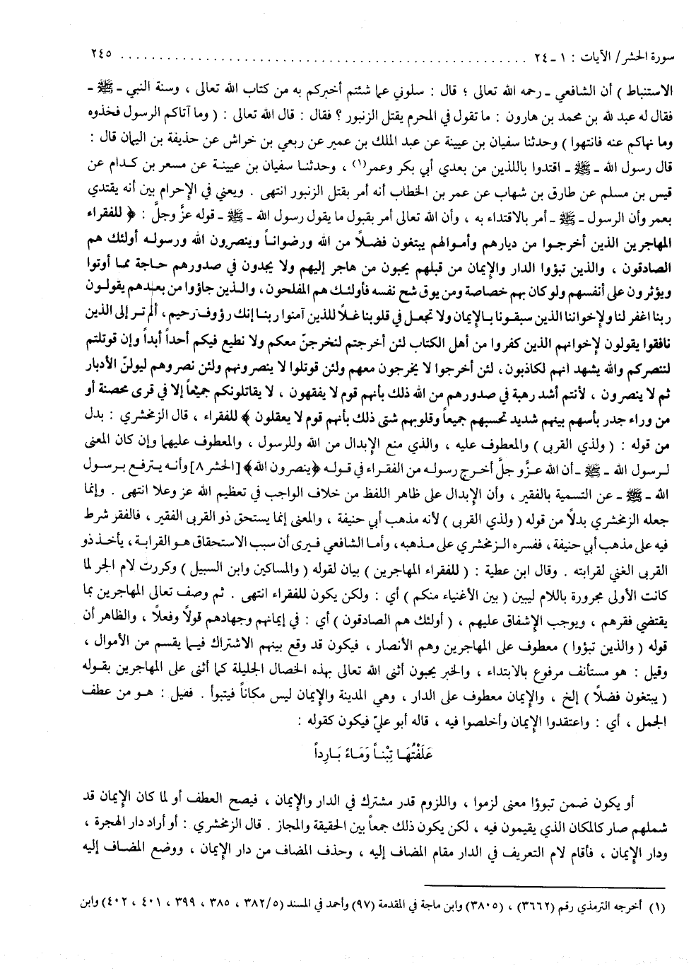 الاستنباط : أن الشافعي ، رحمه الله تعالى ، قال : سلوني عما شئتم أخبركم به من كتاب الله تعالى وسنة النبي ( صلى الله عليه وسلم ) ) . فقال له عبد الله بن محمد بن هارون : ما تقول في المحرم يقتل الزنبور ؟ فقال : قال الله تعالى : ) وَمَا ءاتَاكُمُ الرَّسُولُ فَخُذُوهُ وَمَا نَهَاكُمْ عَنْهُ فَانتَهُواْ ). وحدثنا سفيان بن عيينة ، عن عبد الملك بن عمير ، عن ربعي بن خراش ، عن حذيفة بن اليمان ، قال : قال رسول الله ( صلى الله عليه وسلم ) ) : ( اقتدوا بالذين من بعدي أبي بكر وعمر ) . وحدثنا سفيان بن عيينة ، عن مسعر بن كدام ، عن قيس بن مسلم ، عن طارق بن شهاب ، عن عمر بن الخطاب ، أنه أمر بقتل الزنبور . انتهى . ويعني في الإحرام . بين أنه يقتدي بعمر ، وأن الرسول ( صلى الله عليه وسلم ) ) أمر بالاقتداء به ، وأن الله تعالى أمر بقبول ما يقول رسول الله ( صلى الله عليه وسلم ) ) .