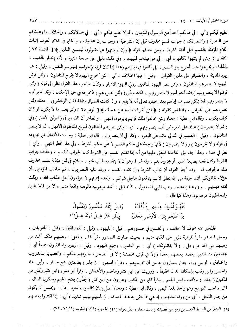 نُطِيعُ فيكُمْ ( : أي في قتالكم ، ( أَحَدًا ( : من الرسول والمؤمنين ؛ أو ) لا نُطِيعُ فيكُمْ ( : أي في خذلانكم وإخلاف ما وعدناكم من النصرة ، و ) لَنَنصُرَنَّكُمْ ( : جواب قسم محذوف قبل أن الشرطية ، وجواب أن محذوف ، والكثير في كلام العرب إثبات اللام المؤذنة بالقسم قبل أداة الشرط ، ومن حذفها قوله : ) وَإِن لَّمْ يَنتَهُواْ عَمَّا يَقُولُونَ لَيَمَسَّنَّ الَّذِينَ ( ، التقدير : ولئن لم ينتهوا لكاذبون ، أي في مواعيدهم لليهود ، وفي ذلك دليل على صحة النبوة لأنه إخبار بالغيب ، ولذلك لم يخرجوا حين أخرج بنو النضير ، بل أقاموا في ديارهم ، وهذا إذا كان قوله : ) لإِخْوانِهِمْ ( أنهم بنو النضير . وقيل : هم يهود المدينة ، والضمائر على هذين القولين . وقيل : فيها اختلاف ، أي لئن أخرج اليهود لا يخرج المنافقون ، ولئن قوتل اليهود لا ينصرهم المنافقون ، ولئن نصر اليهود المنافقين ليولي اليهود الأدبار ، وكأن صاحب هذا القول نظر إلى قوله : ) وَلَئِن قُوتِلُواْ لاَ يَنصُرُونَهُمْ ( ، فقد أخبر أنهم لا ينصرونهم ، فكيف يأتي ) وَلَئِن نَّصَرُوهُمْ ( ؟ فأخرجه في حيز الإمكان ، وقد أخبر أنهم لا ينصرونهم ، فلا يمكن نصرهم إياهم بعد إخباره تعالى أنه لا يقع . وإذا كانت الضمائر متفقة ، فقال الزمخشري : معناه ولئن نصروهم على الفرض ، والتقدير كقوله : ) لَئِنْ أَشْرَكْتَ لَيَحْبَطَنَّ عَمَلُكَ ( ، وكما يعلم ما لا يكون لو كان كيف يكون . وقال ابن عطية : معناه : ولئن خالفوا ذلك فإنهم ينهزمون . انتهى . والظاهر أن الضمير في ) لَيُوَلُّنَّ الاْدْبَارَ ( ، وفي ) ثُمَّ لاَ يُنصَرُونَ ( عائد على المفروض أنهم ينصرونهم ، أي ولئن نصرهم المنافقون ليولن المنافقون الأدبار ، ثم لا ينصر المنافقون . وقيل : الضمير في التولي عائد على اليهود ، وكذا في ) لاَ يُنصَرُونَ ). قال ابن عطية : وجاءت الأفعال غير مجزومة في قوله : ) لاَ يَخْرُجُونَ ( و ) لاَ يُنصَرُونَ ( لأنها راجعة على حكم القسم ، لا على حكم الشرط ، وفي هذا نظر . انتهى . وأي نظر في هذا ؟ وهذا جاء على القاعدة المتفق عليها من أنه إذا تقدم القسم على الشرط كان الجواب للقسم وحذف جواب الشرط ، وكان فعله بصيغة المضي ، أو مجزوماً بلم ، وله شرط ، وهو أن لا يتقدمه طالب خبر . واللام في ) لَئِنْ ( مؤذنة بقسم محذوف قبله ، فالجواب له . وقد أجاز الفراء أن يجاب الشرط ، وأن تقدم القسم ، ورده عليه البصريون .