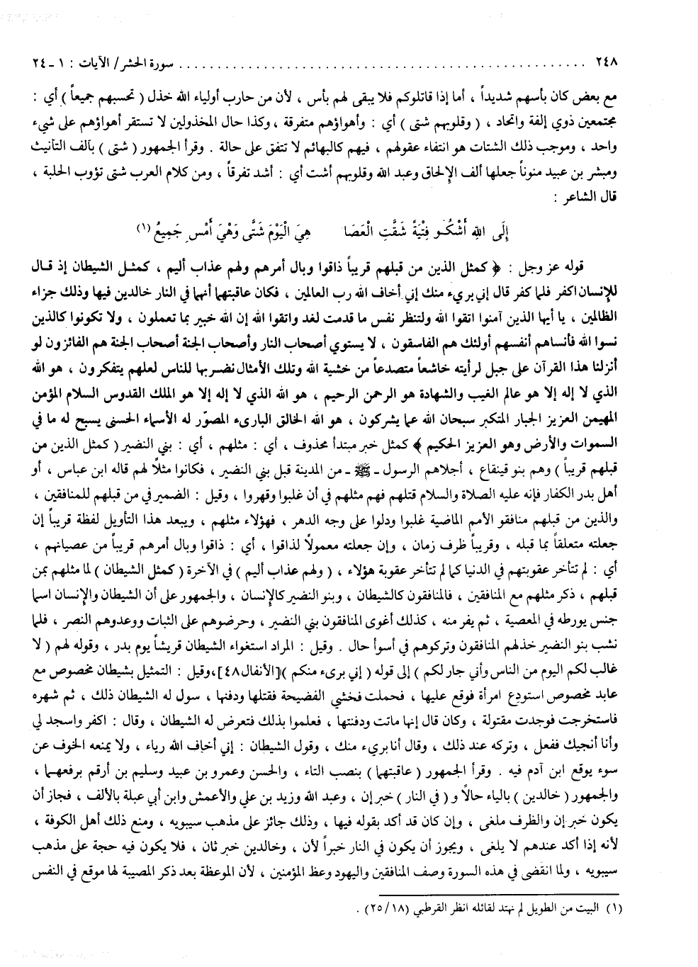 ( كَمَثَلِ الشَّيْطَانِ ( : لما مثلهم بمن قبلهم ، ذكر مثلهم مع المنافقين ، فالمنافقون كالشيطان ، وبنو النضير كالإنسان ، والجمهور : على أن الشيطان والإنسان اسما جنس يورطه في المعصية ثم يفر منه . كذلك أغوى المنافقون بني النضير ، وحرضوهم على الثبات ، ووعدوهم النصر . فلما نشب بنو النضير ، خذلهم المنافقون وتركوهم في أسوأ حال . وقيل : المراد استغواء الشيطان قريشاً يوم بدر . وقوله لهم : ) لاَ غَالِبَ لَكُمُ الْيَوْمَ مِنَ النَّاسِ وَإِنّي جَارٌ لَّكُمْ ( إلى قوله : ) إِنّي بَرِىء مّنْكُمْ ). وقيل : التمثيل بشيطان مخصوص مع عابد مخصوص استودع امرأة ، فوقع عليها فحملت ، فخشي الفضيحة ، فقتلها ودفنها . سول له الشيطان ذلك ، ثم شهره ، فاستخرجت فوجدت مقتولة ؛ وكان قال إنها ماتت ودفنتها ، فعلموا بذلك ، فتعرض له الشيطان وقال : اكفر واسجد لي وأنا أنجيك ، ففعل وتركه عند ذلك وقال : أنا بريء منك . وقول الشيطان : ) إِنّى أَخَافُ اللَّهَ ( رياء ، ولا يمنعه الخوف عن سوء يوقع ابن آدم فيه .
