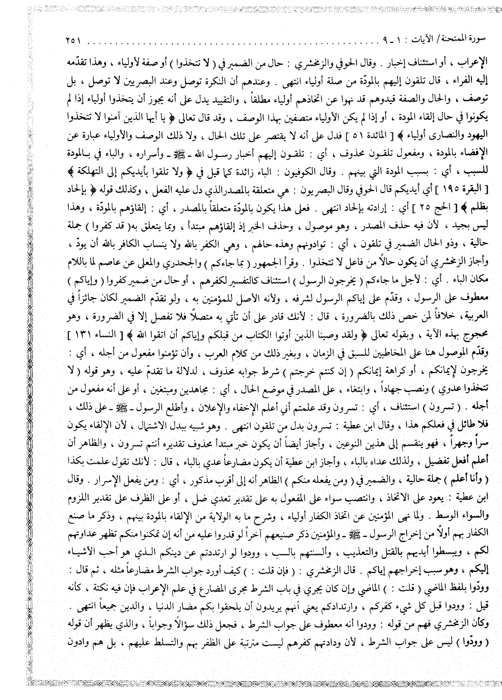 الإعراب ، أو استئناف إخبار . وقال الحوفي والزمخشري : حال من الضمير في ) لاَ تَتَّخِذُواْ ( ، أو صفة لأولياء ، وهذا تقدّمه إليه الفراء ، قال : ) تُلْقُونَ إِلَيْهِمْ بِالْمَوَدَّةِ ( من صلة ) أَوْلِيَاء ). انتهى . وعندهم أن النكرة توصل ، وعند البصريين لا توصل بل توصف ، والحال والصفة قيد وهم قد نهوا عن اتخاذهم أولياء مطلقاً ، والتقييد يدل على أنه يجوز أن يتخذوا أولياء إذا لم يكونوا في حال إلقاء المودة ، أو إذا لم يكن الأولياء متصفين بهذا الوصف ، وقد قال تعالى : ) يُوقِنُونَ يَاأَيُّهَا الَّذِينَ ءامَنُواْ لاَ تَتَّخِذُواْ الْيَهُودَ وَالنَّصَارَى أَوْلِيَاء ( ، فدل على أنه لا يقتصر على تلك الحال ولا ذلك الوصف . والأولياء عبارة عن الإفضاء بالمودة ، ومفعول ) تُلْقُونَ ( محذوف ، أي تلقون إليهم أخبار رسول الله ( صلى الله عليه وسلم ) ) وأسراره . والباء في ) بِالْمَوَدَّةِ ( للسبب ، أي بسبب المودة التي بينهم . وقال الكوفيون : الباء زائدة ، كما قيل : في : ) وَلاَ تُلْقُواْ بِأَيْدِيكُمْ إِلَى التَّهْلُكَةِ ( : أي أيديكم . قال الحوفي : وقال البصريون هي متعلقة بالمصدر الذي دل عليه الفعل ، وكذلك قوله ) بِإِلْحَادٍ بِظُلْمٍ ( : أي إرادته بإلحاد . انتهى . فعلى هذا يكون ) بِالْمَوَدَّةِ ( متعلقاً بالمصدر ، أي إلقاؤهم بالمودّة ، وهذا ليس بجيد ، لأن فيه حذف المصدر ، وهو موصول ، وحذف الخبر ، إذ إلقاؤهم مبتدأ وبما يتعلق به ، ( وَقَدْ كَفَرُواْ ( جملة حالية ، وذو الحال الضمير في ) تُلْقُونَ ( : أي توادونهم ، وهذه حالهم ، وهي الكفر بالله ، ولا يناسب الكافر بالله أن يودّ . وأجاز الزمخشري أن يكون حالاً من فاعل ) لاَ تَتَّخِذُواْ ).