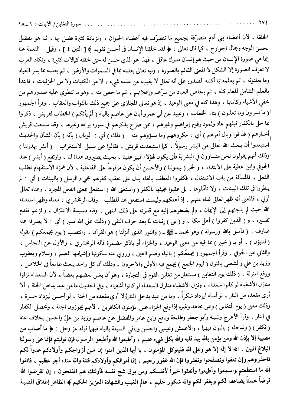 قوله عز وجل : ) مَا أَصَابَ مِن مُّصِيبَةٍ إِلاَّ بِإِذْنِ اللَّهِ وَمَن يُؤْمِن بِاللَّهِ يَهْدِ قَلْبَهُ وَاللَّهُ بِكُلّ شَىْء عَلِيمٌ وَأَطِيعُواْ اللَّهَ وَأَطِيعُواْ الرَّسُولَ فَإِن تَولَّيْتُمْ فَإِنَّمَا عَلَى رَسُولِنَا الْبَلَاغُ الْمُبِينُ اللَّهُ لاَ إِلَاهَ إِلاَّ هُوَ وَعَلَى اللَّهِ فَلْيَتَوَكَّلِ الْمُؤْمِنُونَ الْمُؤْمِنُونَ يأَيُّهَا الَّذِينَ ءامَنُواْ إِنَّ مِنْ أَزْواجِكُمْ وَأَوْلادِكُمْ عَدُوّاً لَّكُمْ فَاحْذَرُوهُمْ وَإِن تَعْفُواْ وَتَصْفَحُواْ وَتَغْفِرُواْ فَإِنَّ اللَّهَ غَفُورٌ رَّحِيمٌ إِنَّمَا أَمْوالُكُمْ وَأَوْلَادُكُمْ فِتْنَةٌ وَاللَّهُ عِنْدَهُ أَجْرٌ عَظِيمٌ فَاتَّقُواْ اللَّهَ مَا اسْتَطَعْتُمْ وَاسْمَعُواْ وَأَطِيعُواْ وَأَنْفِقُواْ خَيْراً لاِنفُسِكُمْ وَمَن يُوقَ شُحَّ نَفْسِهِ فَأُوْلَئِكَ هُمُ الْمُفْلِحُونَ إِن تُقْرِضُواْ اللَّهَ قَرْضاً حَسَناً يُضَاعِفْهُ لَكُمْ وَيَغْفِرْ لَكُمْ وَاللَّهُ شَكُورٌ حَلِيمٌ عَالِمُ الْغَيْبِ وَالشَّهَادَةِ الْعَزِيزُ الْحَكِيمُ ).