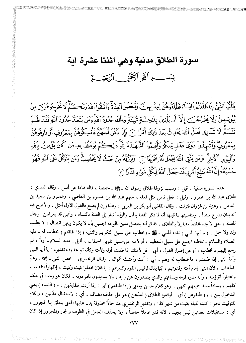 2 ( ) ياأيُّهَا النَّبِىُّ إِذَا طَلَّقْتُمُ النِّسَآءَ فَطَلِّقُوهُنَّ لِعِدَّتِهِنَّ وَأَحْصُواْ الْعِدَّةَ وَاتَّقُواْ اللَّهَ رَبَّكُمْ لاَ تُخْرِجُوهُنَّ مِن بُيُوتِهِنَّ وَلاَ يَخْرُجْنَ إِلاَّ أَن يَأْتِينَ بِفَاحِشَةٍ مُّبَيِّنَةٍ وَتِلْكَ حُدُودُ اللَّهِ وَمَن يَتَعَدَّ حُدُودَ اللَّهِ فَقَدْ ظَلَمَ نَفْسَهُ لاَ تَدْرِى لَعَلَّ اللَّهَ يُحْدِثُ بَعْدَ ذَلِكَ أَمْراً فَإِذَا بَلَغْنَ أَجَلَهُنَّ فَأَمْسِكُوهُنَّ بِمَعْرُوفٍ أَوْ فَارِقُوهُنَّ بِمَعْرُوفٍ وَأَشْهِدُواْ ذَوَى عَدْلٍ مِّنكُمْ وَأَقِيمُواْ الشَّهَادَةَ لِلَّهِ ذَلِكُمْ يُوعَظُ بِهِ مَن كَانَ يُؤْمِنُ بِاللَّهِ وَالْيَوْمِ الاٌّ خِرِ وَمَن يَتَّقِ اللَّهَ يَجْعَل لَّهُ مَخْرَجاً وَيَرْزُقْهُ مِنْ حَيْثُ لاَ يَحْتَسِبُ وَمَن يَتَوَكَّلْ عَلَى اللَّهِ فَهُوَ حَسْبُهُ إِنَّ اللَّهَ بَالِغُ أَمْرِهِ قَدْ جَعَلَ اللَّهُ لِكُلِّ شَىْءٍ قَدْراً وَاللاَّئِى يَئِسْنَ مِنَ الْمَحِيضِ مِن نِّسَآئِكُمْ إِنِ ارْتَبْتُمْ فَعِدَّتُهُنَّ ثَلَاثَةُ أَشْهُرٍ وَاللَّاتِي لَمْ يَحِضْنَ وَأُوْلَاتُ الاٌّ حْمَالِ أَجَلُهُنَّ أَن يَضَعْنَ حَمْلَهُنَّ وَمَن يَتَّقِ اللَّهَ يَجْعَل لَّهُ مِنْ أَمْرِهِ يُسْراً ذَلِكَ أَمْرُ اللَّهِ أَنزَلَهُ إِلَيْكُمْ وَمَن يَتَّقِ اللَّهَ يُكَفِّرْ عَنْهُ سَيِّئَاتِهِ وَيُعْظِمْ لَهُ أَجْراً أَسْكِنُوهُنَّ مِنْ حَيْثُ سَكَنتُم مِّن وُجْدِكُمْ وَلاَ تُضَآرُّوهُنَّ لِتُضَيِّقُواْ عَلَيْهِنَّ وَإِن كُنَّ أُوْلَاتِ حَمْلٍ فَأَنفِقُواْ عَلَيْهِنَّ حَتَّى يَضَعْنَ حَمْلَهُنَّ فَإِنْ أَرْضَعْنَ لَكُمْ فَأاتُوهُنَّ أُجُورَهُنَّ وَأْتَمِرُواْ بَيْنَكُمْ بِمَعْرُوفٍ وَإِن تَعَاسَرْتُمْ فَسَتُرْضِعُ لَهُ أُخْرَى لِيُنفِقْ ذُو سَعَةٍ مِّن سَعَتِهِ وَمَن قُدِرَ عَلَيْهِ رِزْقُهُ فَلْيُنفِقْ مِمَّآ ءَاتَاهُ اللَّهُ لاَ يُكَلِّفُ اللَّهُ نَفْساً إِلاَّ مَآ ءَاتَاهَا سَيَجْعَلُ اللَّهُ بَعْدَ عُسْرٍ يُسْراً وَكَأِيِّن مِّن قَرْيَةٍ عَتَتْ عَنْ أَمْرِ رَبِّهَا وَرُسُلِهِ فَحَاسَبْنَاهَا حِسَاباً شَدِيداً وَعَذَّبْنَاهَا عَذَاباً نُّكْراً فَذَاقَتْ وَبَالَ أَمْرِهَا وَكَانَ عَاقِبَةُ أَمْرِهَا خُسْراً أَعَدَّ اللَّهُ لَهُمْ عَذَاباً شَدِيداً فَاتَّقُواْ اللَّهَ ياأُوْلِى الأَلْبَابِ الَّذِينَ ءَامَنُواْ قَدْ أَنزَلَ اللَّهُ إِلَيْكُمْ ذِكْراً رَّسُولاً يَتْلُو عَلَيْكُمْ ءَايَاتِ اللَّهِ مُبَيِّنَاتٍ لِّيُخْرِجَ الَّذِينَ ءَامَنُواْ وَعَمِلُواْ الصَّالِحَاتِ مِنَ الظُّلُمَاتِ إِلَى النُّورِ وَمَن يُؤْمِن بِاللَّهِ وَيَعْمَلْ صَالِحاً يُدْخِلْهُ جَنَّاتٍ تَجْرِى مِن تَحْتِهَا الاٌّ نْهَارُ خَالِدِينَ فِيهَآ أَبَداً قَدْ أَحْسَنَ اللَّهُ لَهُ رِزْقاً اللَّهُ الَّذِى خَلَقَ سَبْعَ سَمَاوَاتٍ وَمِنَ الاٌّ رْضِ مِثْلَهُنَّ يَتَنَزَّلُ الاٌّ مْرُ بَيْنَهُنَّ لِّتَعْلَمُواْ أَنَّ اللَّهَ عَلَى كُلِّ شَىْءٍ قَدِيرٌ وَأَنَّ اللَّهَ قَدْ أَحَاطَ بِكُلِّ شَىْءٍ عِلْمَا ( ) ) 2