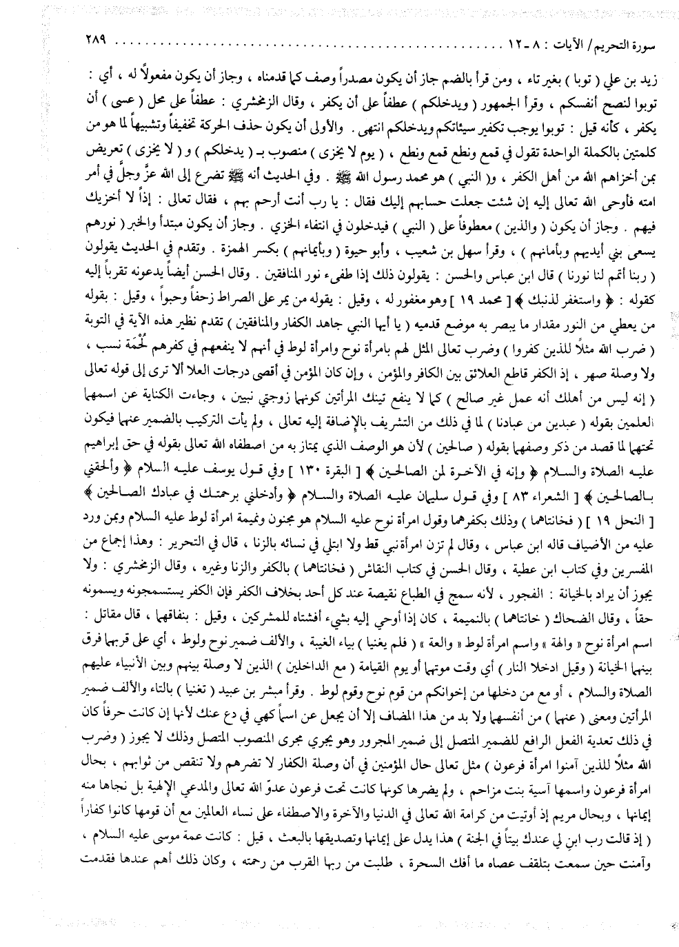 ( ضَرَبَ اللَّهُ مَثَلاً لّلَّذِينَ كَفَرُواْ ( : ضرب تعالى المثل لهم بامرأة نوح وامرأة لوط في أنهم لا ينفعهم في كفرهم لحمة نسب ولا وصلة صهر ، إذ الكفر قاطع العلائق بين الكافر والمؤمن ، وإن كان المؤمن في أقصى درجات العلا . ألا ترى إلى قوله تعالى : ) إِنَّهُ لَيْسَ مِنْ أَهْلِكَ إِنَّهُ عَمَلٌ غَيْرُ صَالِحٍ ( ؟ كما لم ينفع تينك المرأتين كونهما زوجتي نبيين . وجاءت الكناية عن اسمهما العلمين بقوله : ) عَبْدَيْنِ مِنْ عِبَادِنَا ( ، لما في ذلك من التشريف بالإضافة إليه تعالى . ولم يأت التركيب بالضمير عنهما ، فيكون تحتهما لما قصد من ذكر وصفهما بقوله : ) صَالِحِينَ ( ، لأن الصلاح هو الوصف الذي يمتاز به من اصطفاه الله تعالى بقوله في حق إبراهيم عليه الصلاة والسلام : ) وَإِنَّهُ فِى الاْخِرَةِ لَمِنَ الصَّالِحِينَ ( ، وفي قول يوسف عليه السلام : ) وَأَلْحِقْنِى بِالصَّالِحِينَ ( ، وقول سليمان عليه الصلاة والسلام : ) وَأَدْخِلْنِى بِرَحْمَتِكَ فِى عِبَادِكَ الصَّالِحِينَ ). ) فَخَانَتَاهُمَا ( ، وذلك بكفرهما وقول امرأة نوح عليه السلام : هو مجنون ، ونميمة امرأة لوط عليه السلام بمن ورد عليه من الأضياف ، قاله ابن عباس . وقال : لم تزن امرأة نبي قط ، ولا ابتلي في نسائه بالزنا . قال في التحرير : وهذا إجماع من المفسرين ، وفي كتاب ابن عطية . وقال الحسن في كتاب النقاش : فخانتاهما بالكفر والزنا وغيره . وقال الزمخشري : ولا يجوز أن يراد بالخيانة الفجور ، لأنه سمج في الطباع نقيصة عند كل أحد ، بخلاف الكفر ، فإن الكفر يستسمجونه ويسمونه حقاً . وقال الضحاك : خانتاهما بالنميمة ، كان إذا أوحى إليه بشيء أفشتاه للمشركين ، وقيل : خانتاهما بنفاقهما . قال مقاتل : اسم امرأة نوح والهة ، واسم امرأة لوط والعة . ) فَلَمْ يُغْنِينَا ( بياء الغيبة ، والألف ضمير نوح ولوط : أي على قربهما منهما فرق بينهما الخيانة . ) وَقِيلَ ادْخُلاَ النَّارَ ( : أي وقت موتهما ، أو يوم القيامة ؛ ) مَعَ الدخِلِينَ ( : الذين لا وصلة بينهم وبين الأنبياء عليهم الصلاة والسلام ، أو مع من دخلها من إخوانكما من قوم نوح وقوم لوط . وقرأ مبشر بن عبيد : تغنيا بالتاء ، والألف ضمير المرأتين ، ومعنى ) عَنْهُمَا ( : عن أنفسهما ، ولا بد من هذا المضاف إلا أن يجعل عن اسما ، كهي في : دع عنك ، لأنها إن كانت حرفاً ، كان في ذلك تعدية الفعل الرافع للضمير المتصل إلى ضمير المجرور ، وهو يجري مجرى المنصوب المتصل ، وذلك لا يجوز .