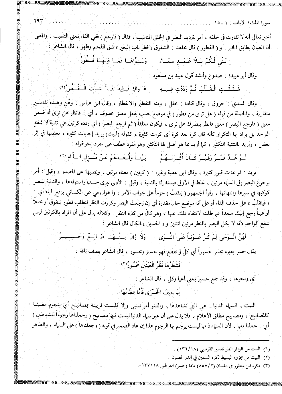 وقال السدي : خروق . وقال قتادة : خلل ، ومنه التفطير والانفطار . وقال ابن عباس : وهن وهذه تفاسير متقاربة ، والجملة من قوله : ) الْبَصَرَ هَلْ تَرَى مِن فُطُورٍ ( في موضع نصب بفعل معلق محذوف ، أي فانظر هل ترى ، أو ضمن معنى ) فَارْجِعِ الْبَصَرَ ( معنى فانظر ببصرك هل ترى ؟ فيكون معلقاً . ) ثُمَّ اْرجِعِ البَصَرَ ( : أي ردده كرتين هي تثنية لا شفع الواحد ، بل يراد بها التكرار ، كأنه قال : كرة بعد كرة ، أي كرات كثيرة ، كقوله : لبيك ، يريد إجابات كثيرة بعضها في إثر بعض ، وأريد بالتنثية التكثير ، كما أريد بما هو أصل لها التكثير ، وهو مفرد عطف على مفرد ، نحو قوله : لو عدّ قبر وقبر كان أكرمهم