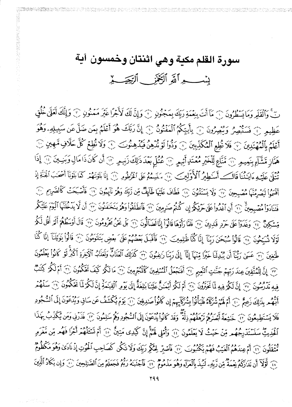 2 ( ) نوَالْقَلَمِ وَمَا يَسْطُرُونَ مَآ أَنتَ بِنِعْمَةِ رَبِّكَ بِمَجْنُونٍ وَإِنَّ لَكَ لاّجْراً غَيْرَ مَمْنُونٍ وَإِنَّكَ لَعَلَى خُلُقٍ عَظِيمٍ فَسَتُبْصِرُ وَيُبْصِرُونَ بِأَيِّكُمُ الْمَفْتُونُ إِنَّ رَبَّكَ هُوَ أَعْلَمُ بِمَن ضَلَّ عَن سَبِيلِهِ وَهُوَ أَعْلَمُ بِالْمُهْتَدِينَ فَلاَ تُطِعِ الْمُكَذِّبِينَ وَدُّواْ لَوْ تُدْهِنُ فَيُدْهِنُونَ وَلاَ تُطِعْ كُلَّ حَلاَّفٍ مَّهِينٍ هَمَّازٍ مَّشَّآءِ بِنَمِيمٍ مَّنَّاعٍ لِّلْخَيْرِ مُعْتَدٍ أَثِيمٍ عُتُلٍّ بَعْدَ ذَلِكَ زَنِيمٍ أَن كَانَ ذَا مَالٍ وَبَنِينَ إِذَا تُتْلَى عَلَيْهِ ءَايَاتُنَا قَالَ أَسَاطِيرُ الاٌّ وَّلِينَ سَنَسِمُهُ عَلَى الْخُرْطُومِ إِنَّا بَلَوْنَاهُمْ كَمَا بَلَوْنَآ أَصْحَابَ الْجَنَّةِ إِذْ أَقْسَمُواْ لَيَصْرِمُنَّهَا مُصْبِحِينَ وَلاَ يَسْتَثْنُونَ فَطَافَ عَلَيْهَا طَآئِفٌ مِّن رَّبِّكَ وَهُمْ نَآئِمُونَ فَأَصْبَحَتْ كَالصَّرِيمِ فَتَنَادَوْاْ مُصْبِحِينَ أَنِ اغْدُواْ عَلَى حَرْثِكُمْ إِن كُنتُمْ صَارِمِينَ فَانطَلَقُواْ وَهُمْ يَتَخَافَتُونَ أَن لاَّ يَدْخُلَنَّهَا الْيَوْمَ عَلَيْكُمْ مِّسْكِينٌ وَغَدَوْاْ عَلَى حَرْدٍ قَادِرِينَ فَلَمَّا رَأَوْهَا قَالُواْ إِنَّا لَضَآلُّونَ بَلْ نَحْنُ مَحْرُومُونَ قَالَ أَوْسَطُهُمْ أَلَمْ أَقُلْ لَّكُمْ لَوْلاَ تُسَبِّحُونَ قَالُواْ سُبْحَانَ رَبِّنَآ إِنَّا كُنَّا ظَالِمِينَ فَأَقْبَلَ بَعْضُهُمْ عَلَى بَعْضٍ يَتَلَاوَمُونَ قَالُواْ ياوَيْلَنَآ إِنَّا كُنَّا طَاغِينَ عَسَى رَبُّنَآ أَن يُبْدِلَنَا خَيْراً مِّنْهَآ إِنَّآ إِلَى رَبِّنَا رَاغِبُونَ كَذَلِكَ الْعَذَابُ وَلَعَذَابُ الاٌّ خِرَةِ أَكْبَرُ لَوْ كَانُواْ يَعْلَمُونَ إِنَّ لِّلْمُتَّقِينَ عِنْدَ رَبِّهِمْ جَنَّاتِ النَّعِيمِ أَفَنَجْعَلُ الْمُسْلِمِينَ كَالْمُجْرِمِينَ مَا لَكُمْ كَيْفَ تَحْكُمُونَ أَمْ لَكُمْ كِتَابٌ فِيهِ تَدْرُسُونَ إِنَّ لَكُمْ فِيهِ لَمَا تَخَيَّرُونَ أَمْ لَكُمْ أَيْمَانٌ عَلَيْنَا بَالِغَةٌ إِلَى يَوْمِ الْقِيَامَةِ إِنَّ لَكُمْ لَمَا تَحْكُمُونَ سَلْهُمْ أَيُّهُم بِذَالِكَ زَعِيمٌ أَمْ لَهُمْ شُرَكَآءُ فَلْيَأتُواْ بِشُرَكَآئِهِمْ إِن كَانُواْ صَادِقِينَ يَوْمَ يُكْشَفُ عَن سَاقٍ وَيُدْعَوْنَ إِلَى السُّجُودِ فَلاَ يَسْتَطِيعُونَ خَاشِعَةً أَبْصَارُهُمْ تَرْهَقُهُمْ ذِلَّةٌ وَقَدْ كَانُواْ يُدْعَوْنَ إِلَى السُّجُودِ وَهُمْ سَالِمُونَ فَذَرْنِى وَمَن يُكَذِّبُ بِهَاذَا الْحَدِيثِ سَنَسْتَدْرِجُهُمْ مِّنْ حَيْثُ لاَ يَعْلَمُونَ وَأُمْلِى لَهُمْ إِنَّ كَيْدِى مَتِينٌ أَمْ تَسْأَلُهُمْ أَجْراً فَهُمْ مِّن مَّغْرَمٍ مُّثْقَلُونَ أَمْ عِندَهُمُ الْغَيْبُ فَهُمْ يَكْتُبُونَ فَاصْبِرْ لِحُكْمِ رَبِّكَ وَلاَ تَكُن كَصَاحِبِ الْحُوتِ إِذْ نَادَى وَهُوَ مَكْظُومٌ لَّوْلاَ أَن تَدَارَكَهُ نِعْمَةٌ مِّن رَّبِّهِ لَنُبِذَ بِالْعَرَآءِ وَهُوَ مَذْمُومٌ فَاجْتَبَاهُ رَبُّهُ فَجَعَلَهُ مِنَ الصَّالِحِينَ وَإِن يَكَادُ الَّذِين