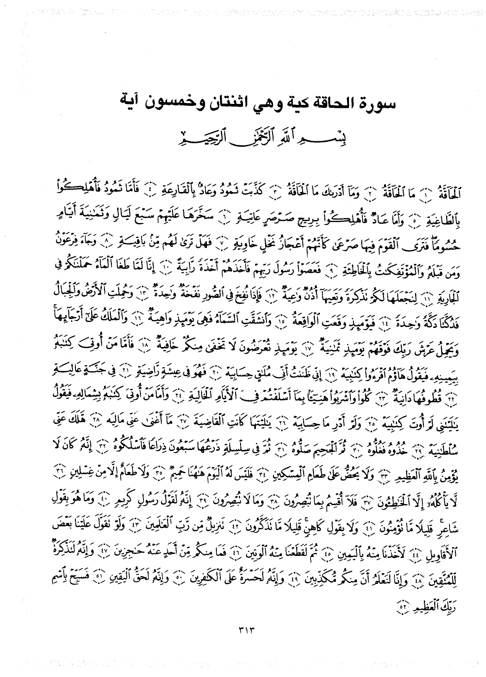 2 ( ) الْحَاقَّةُ مَا الْحَآقَّةُ وَمَآ أَدْرَاكَ مَا الْحَاقَّةُ كَذَّبَتْ ثَمُودُ وَعَادٌ بِالْقَارِعَةِ فَأَمَّا ثَمُودُ فَأُهْلِكُواْ بِالطَّاغِيَةِ وَأَمَّا عَادٌ فَأُهْلِكُواْ بِرِيحٍ صَرْصَرٍ عَاتِيَةٍ سَخَّرَهَا عَلَيْهِمْ سَبْعَ لَيَالٍ وَثَمَانِيَةَ أَيَّامٍ حُسُوماً فَتَرَى الْقَوْمَ فِيهَا صَرْعَى كَأَنَّهُمْ أَعْجَازُ نَخْلٍ خَاوِيَةٍ فَهَلْ تَرَى لَهُم مِّن بَاقِيَةٍ وَجَآءَ فِرْعَوْنُ وَمَن قَبْلَهُ وَالْمُؤْتَفِكَاتُ بِالْخَاطِئَةِ فَعَصَوْاْ رَسُولَ رَبِّهِمْ فَأَخَذَهُمْ أَخْذَةً رَّابِيَةً إِنَّا لَمَّا طَغَا الْمَآءُ حَمَلْنَاكُمْ فِى الْجَارِيَةِ لِنَجْعَلَهَا لَكُمْ تَذْكِرَةً وَتَعِيَهَآ أُذُنٌ وَاعِيَةٌ فَإِذَا نُفِخَ فِى الصُّورِ نَفْخَةٌ وَاحِدَةٌ وَحُمِلَتِ الاٌّ رْضُ وَالْجِبَالُ فَدُكَّتَا دَكَّةً وَاحِدَةً فَيَوْمَئِذٍ وَقَعَتِ الْوَاقِعَةُ وَانشَقَّتِ السَّمَآءُ فَهِىَ يَوْمَئِذٍ وَاهِيَةٌ وَالْمَلَكُ عَلَى أَرْجَآئِهَآ وَيَحْمِلُ عَرْشَ رَبِّكَ فَوْقَهُمْ يَوْمَئِذٍ ثَمَانِيَةٌ يَوْمَئِذٍ تُعْرَضُونَ لاَ تَخْفَى مِنكُمْ خَافِيَةٌ فَأَمَّا مَنْ أُوتِىَ كِتَابَهُ بِيَمِينِهِ فَيَقُولُ هَآؤُمُ اقْرَؤُاْ كِتَابيَهْ إِنِّى ظَنَنتُ أَنِّى مُلَاقٍ حِسَابِيَهْ فَهُوَ فِى عِيشَةٍ رَّاضِيَةٍ فِى جَنَّةٍ عَالِيَةٍ قُطُوفُهَا دَانِيَةٌ كُلُواْ وَاشْرَبُواْ هَنِيئَاً بِمَآ أَسْلَفْتُمْ فِى الاٌّ يَّامِ الْخَالِيَةِ وَأَمَّا مَنْ أُوتِىَ كِتَابَهُ بِشِمَالِهِ فَيَقُولُ يالَيْتَنِى لَمْ أُوتَ كِتَابِيَهْ وَلَمْ أَدْرِ مَا حِسَابِيَهْ يالَيْتَهَا كَانَتِ الْقَاضِيَةَ مَآ أَغْنَى عَنِّى مَالِيَهْ هَلَكَ عَنِّى سُلْطَانِيَهْ خُذُوهُ فَغُلُّوهُ ثُمَّ الْجَحِيمَ صَلُّوهُ ثُمَّ فِى سِلْسِلَةٍ ذَرْعُهَا سَبْعُونَ ذِرَاعاً فَاْسْلُكُوهُ إِنَّهُ كَانَ لاَ يُؤْمِنُ بِاللَّهِ الْعَظِيمِ وَلاَ يَحُضُّ عَلَى طَعَامِ الْمِسْكِينِ فَلَيْسَ لَهُ الْيَوْمَ هَاهُنَا حَمِيمٌ وَلاَ طَعَامٌ إِلاَّ مِنْ غِسْلِينٍ لاَّ يَأْكُلُهُ إِلاَّ الْخَاطِئُونَ فَلاَ أُقْسِمُ بِمَا تُبْصِرُونَ وَمَا لاَ تُبْصِرُونَ إِنَّهُ لَقَوْلُ رَسُولٍ كَرِيمٍ وَمَا هُوَ بِقَوْلِ شَاعِرٍ قَلِيلاً مَّا تُؤْمِنُونَ وَلاَ بِقَوْلِ كَاهِنٍ قَلِيلاً مَّا تَذَكَّرُونَ تَنزِيلٌ مِّن رَّبِّ الْعَالَمِينَ وَلَوْ تَقَوَّلَ عَلَيْنَا بَعْضَ الاٌّ قَاوِيلِ لأَخَذْنَا مِنْهُ بِالْيَمِينِ ثُمَّ لَقَطَعْنَا مِنْهُ الْوَتِينَ فَمَا مِنكُم مِّنْ أَحَدٍ عَنْهُ حَاجِزِينَ وَإِنَّهُ لَتَذْكِرَةٌ لِّلْمُتَّقِينَ وَإِنَّا لَنَعْلَمُ أَنَّ مِنكُم مُّكَذِّبِينَ وَإِنَّهُ لَحَسْرَةٌ عَلَى الْكَافِرِينَ وَإِنَّهُ لَحَقُّ الْيَقِينِ فَسَبِّحْ بِاسْمِ رَبِّكَ الْعَظِيمِ ( )