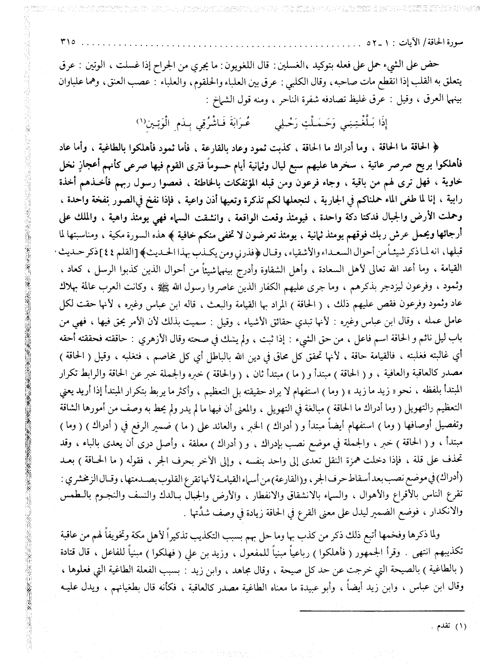 ( الْحَاقَّةُ ( : المراد بها القيامة والبعث ، قاله ابن عباس وغيره ، لأنها حقت لكل عامل عمله . وقال ابن عباس وغيره : لأنها تبدي حقائق الأشياء . وقيل : سميت بذلك لأن الأمر يحق فيها ، فهي من باب ليل نائم . والحاقة اسم فاعل من حق الشيء إذا ثبت ولم يشك في صحته . وقال الأزهري : حاققته فحققته أحقه : أي غالبته فغلبته . فالقيامة حاقة لأنها تحقق كل محاق في دين الله بالباطل ، أي كل مخاصم فتغلبه . وقيل : الحاقة مصدر كالعاقبة والعافية ، والحاقة مبتدأ ،