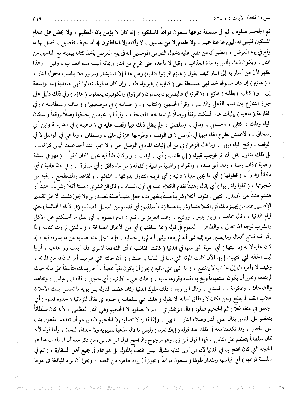 ) ثُمَّ الْجَحِيمَ صَلُّوهُ ( ، قال الزمخشري : ثم لا تصلوه إلا الجحيم ، وهي النار العظمى ، لأنه كان سلطاناً يتعظم على الناس . يقال : صلى النار وصلاه النار . انتهى ، وإنما قدره لا تصلوه إلا الجحيم ، لأنه يزعم أن تقديم المفعول يدل على الحصر . وقد تكلمنا معه في ذلك عند قوله : ) إِيَّاكَ نَعْبُدُ ( ، وليس ما قاله مذهباً لسيبويه ولا لحذاق النحاة . وأما قوله : لأنه كان سلطاناً يتعظم على الناس ، فهذا قول ابن زيد وهو مرجوح ، والراجح قول ابن عباس ومن ذكر معه : أن السلطان هنا هو الحجة التي كان يحتج بها في الدنيا ، لأن من أوتي كتابه بشماله ليس مختصاً بالملوك ، بل هو عام في جميع أهل الشقاوة .