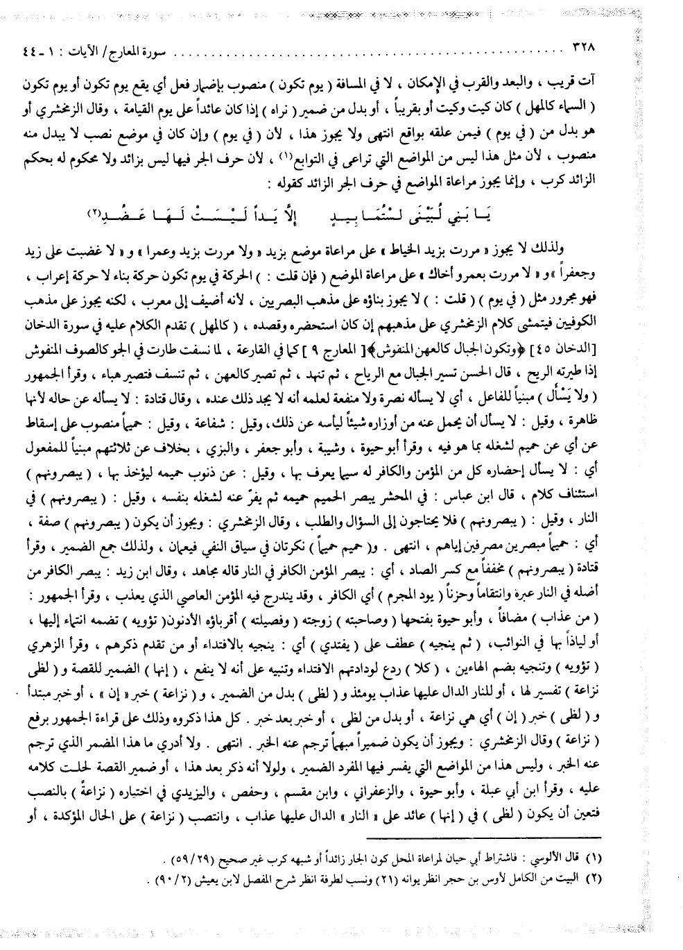 ولذلك لا يجوز : مررت بزيد الخياط ، على مراعاة موضع بزيد ، ولا مررت بزيد وعمراً ، ولا غضبت على زيد وجعفراً ، ولا مررت بعمرو أخاك على مراعاة الموضع . فإن قلت : الحركة في يوم تكون حركة بناء لا حركة إعراب ، فهو مجرور مثل ) فِى يَوْمٍ ). قلت : لا يجوز بناؤه على مذهب البصريين لأنه أضيف إلى معرب ، لكنه يجوز على مذهب الكوفيين ، فيتمشى كلام الزمخشري على مذهبهم إن كان استحضره وقصده . ) كَالْمُهْلِ ( : تقدم الكلام عليه في سورة الدخان ، ( وَتَكُونُ الْجِبَالُ كَالْعِهْنِ الْمَنفُوشِ ( ، كما في القارعة ،
