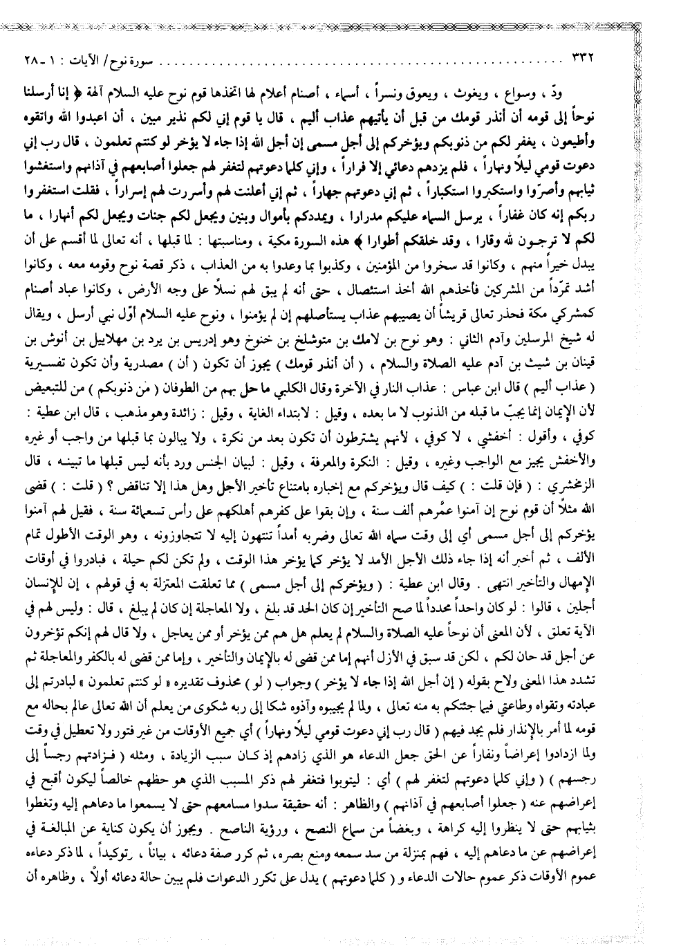 هذه السورة مكية . ومناسبتها لما قبلها : أنه تعالى لما أقسم على أن يبدل خيراً منهم ، وكانوا قد سخروا من المؤمنين وكذبوا بما وعدوا به من العذاب ، ذكر قصة نوح وقومه معه ، وكانوا أشد تمرّداً من المشركين ، فأخذهم الله أخذ استئصال حتى أنه لم يبق لهم نسلاً على وجه الأرض ، وكانوا عباد أصنام كمشركي مكة ، فحذر تعالى قريشاً أن يصيبهم عذاب يستأصلهم إن لم يؤمنوا . ونوح عليه السلام أوّل نبي أرسل ، ويقال له شيخ المرسلين ، وآدم الثاني ، وهو نوح بن لامك بن متوشلخ بن خنوخ ، وهو إدريس بن برد بن مهلاييل بن أنوش بن قينان بن شيث بن آدم عليه الصلاة والسلام . ) أَنْ أَنذِرْ قَوْمَكَ ( : يجوز أن تكون أن مصدرية وأن تكون تفسيرية . ) عَذَابٌ أَلِيمٌ ( ، قال أبو عباس : عذاب النار في الآخرة . وقال الكلبي : ما حل بهم من الطوفان .