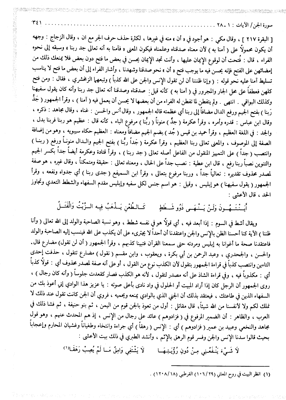 ( وَأَنَّهُ كَانَ رِجَالٌ ). روى الجمهور أن الرجل كان إذا أراد المبيت أو الحلول في وادٍ نادى بأعلى صوته : يا عزيز هذا الوادي إني أعوذ بك من السفهاء الذين في طاعتك ، فيعتقد بذلك أن الجني الذي بالوادي يمنعه ويحميه . فروي أن الجن كانت تقول عند ذلك : لا نملك لكم ولا لأنفسنا من الله شيئاً . قال مقاتل : أول من تعوذ بالجن قوم من اليمن ، ثم بنو حنيفة ، ثم فشا ذلك في العرب . والظاهر أن الضمير المرفوع في ) فَزَادوهُمْ ( عائد على ) رِجَالٌ مّنَ الإِنسِ ( ، إذ هم المحدث عنهم ، وهو قول مجاهد والنخعي وعبيد بن عمير . ) فَزَادوهُمْ ( أي الإنس ، ( رَهَقاً ( : أي جراءة وانتخاءً وطغياناً وغشيان المحارم وإعجاباً بحيث قالوا : سدنا الإنس والجن ، وفسر قوم الرهق بالإثم . وأنشد الطبري في ذلك بيت الأعشى : لا شيء ينفعني من دون رؤيتها