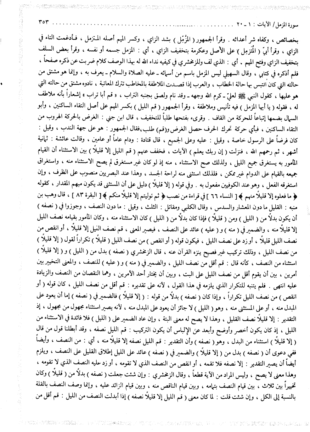 وقال الزمخشري : وإن شئت جعلت نصفه بدلاً من قليلاً ، وكان تخييراً بين ثلاث : بين قيام النصف بتمامه ، وبين قيام الناقص منه ، وبين قيام الزائد عليه ؛ وإنما وصف النصف بالقلة بالنسبة إلى الكل . وإن شئت قلت : لما كان معنى ) قُمِ الَّيْلَ إِلاَّ قَلِيلاً نّصْفَهُ ( : إذا أبدلت النصف من الليل ، قم أقل من