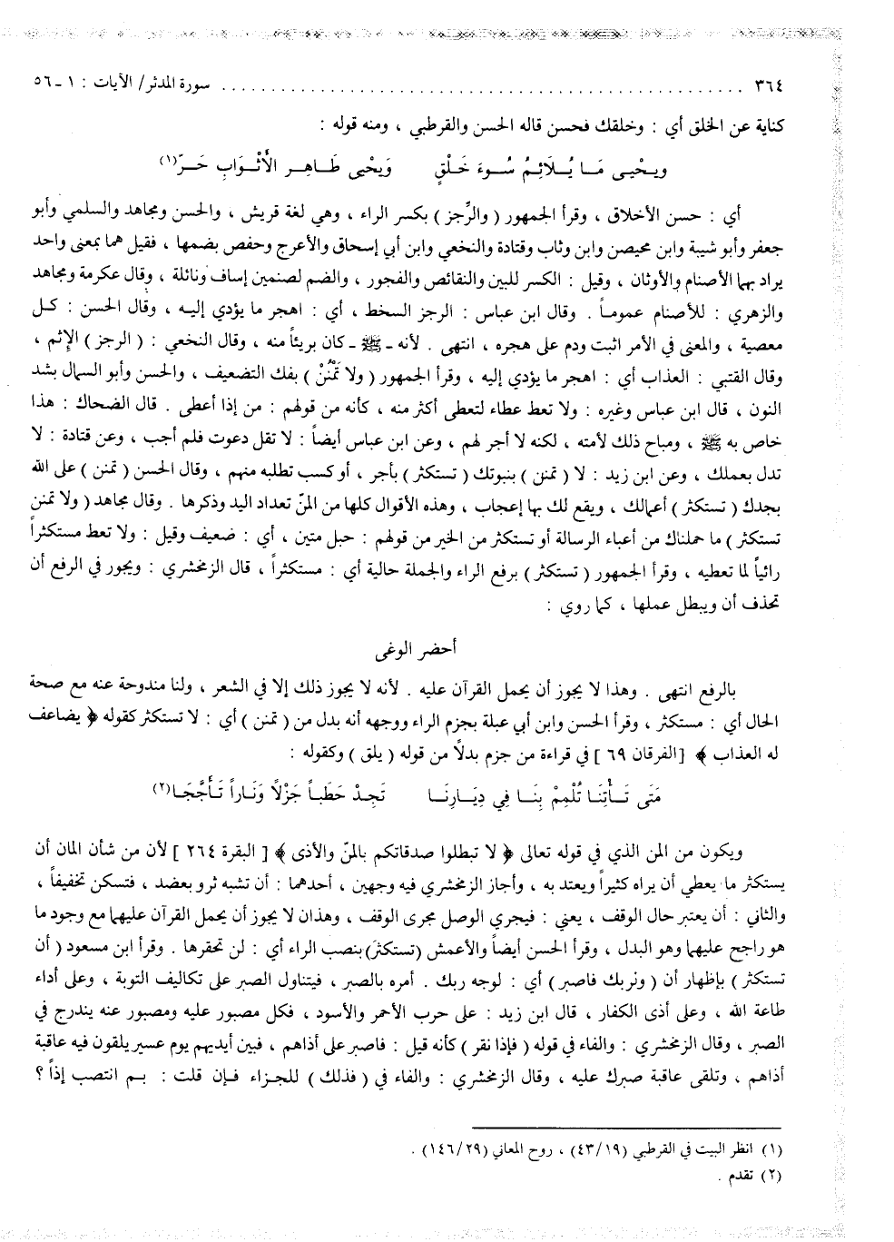 وقرأ الجمهور : ) وَلاَ تَمْنُن ( ، بفك التضعيف ؛ والحسن وأبو السمال : بشد النون . قال ابن عباس وغيره : لا تعط عطاء لتعطي أكثر منه ، كأنه من قولهم : منّ إذا أعطى . قال الضحاك : هذا خاص به ( صلى الله عليه وسلم ) ) ، ومباح ذلك لأمته ، لكنه لا أجر لهم . وعن ابن عباس أيضاً : لا تقل دعوت فلم أجب . وعن قتادة : لا تدل بعملك . وعن ابن زيد : لا تمنن بنبوتك ، تستكثر بأجر أو كسب تطلبه منهم . وقال الحسن : تمنن على الله بجدك ، تستكثر أعمالك ويقع لك بها إعجاب ، وهذه الأقوال كلها من المنّ تعداد اليد وذكرها . وقال مجاهد : ) وَلاَ تَمْنُن تَسْتَكْثِرُ ( ما حملناك من أعباء الرسالة ، أو تستكثر من الخير ، من قولهم : حبل متين : أي ضعيف . وقيل : ولا تعط مستكثراً رائياً لما تعطيه . وقرأ الجمهور : تستكثر برفع الراء ، والجملة حالية ، أي مستكثراً . قال الزمخشري : ويجوز في الرفع أن تحذف أن ويبطل عملها ، كما روي : أحضر الوغى بالرفع . انتهى ، وهذا لا يجوز أن يحمل القرآن عليه ، لأنه لا يجوز ذلك إلا في الشعر ، ولنا مندوحة عنه مع صحة الحال ، أي مستكثراً . وقرأ الحسن وابن أبي عبلة : بجزم الراء ، ووجهه أنه بدل من تمنن ، أي لا تستكثر ، كقوله : ) يُضَاعَفْ لَهُ الْعَذَابُ ( في قراءة من جزم ، بدلاً من قوله : ) يَلْقَ ( ، وكقوله : متى تأتنا تلمم بنا في ديارنا