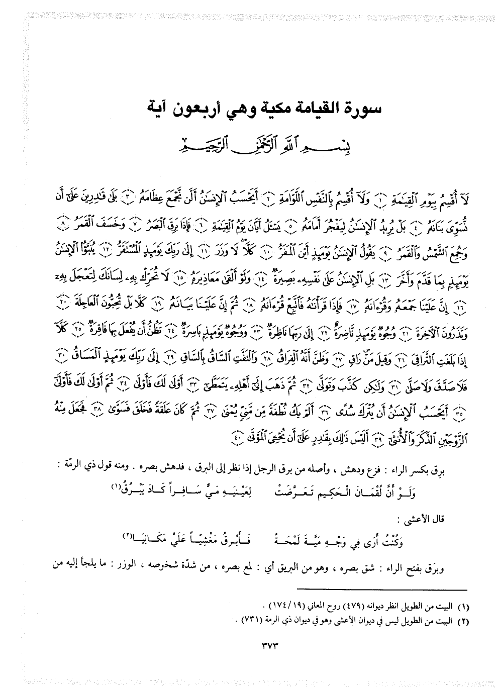 2 ( ) لاَ أُقْسِمُ بِيَوْمِ الْقِيَامَةِ وَلاَ أُقْسِمُ بِالنَّفْسِ اللَّوَّامَةِ أَيَحْسَبُ الإِنسَانُ أَلَّن نَّجْمَعَ عِظَامَهُ بَلَى قَادِرِينَ عَلَى أَن نُّسَوِّىَ بَنَانَهُ بَلْ يُرِيدُ الإِنسَانُ لِيَفْجُرَ أَمَامَهُ يَسْألُ أَيَّانَ يَوْمُ الْقِيَامَةِ فَإِذَا بَرِقَ الْبَصَرُ وَخَسَفَ الْقَمَرُ وَجُمِعَ الشَّمْسُ وَالْقَمَرُ يَقُولُ الإِنسَانُ يَوْمَئِذٍ أَيْنَ الْمَفَرُّ كَلاَّ لاَ وَزَرَ إِلَى رَبِّكَ يَوْمَئِذٍ الْمُسْتَقَرُّ يُنَبَّأُ الإِنسَانُ يَوْمَئِذِ بِمَا قَدَّمَ وَأَخَّرَ بَلِ الإِنسَانُ عَلَى نَفْسِهِ بَصِيرَةٌ وَلَوْ أَلْقَى مَعَاذِيرَهُ لاَ تُحَرِّكْ بِهِ لِسَانَكَ لِتَعْجَلَ بِهِ إِنَّ عَلَيْنَا جَمْعَهُ وَقُرْءَانَهُ فَإِذَا قَرَأْنَاهُ فَاتَّبِعْ قُرْءَانَهُ ثُمَّ إِنَّ عَلَيْنَا بَيَانَهُ كَلاَّ بَلْ تُحِبُّونَ الْعَاجِلَةَ وَتَذَرُونَ الاٌّ خِرَةَ وُجُوهٌ يَوْمَئِذٍ نَّاضِرَةٌ إِلَى رَبِّهَا نَاظِرَةٌ وَوُجُوهٌ يَوْمَئِذٍ بَاسِرَةٌ تَظُنُّ أَن يُفْعَلَ بِهَا فَاقِرَةٌ كَلاَّ إِذَا بَلَغَتِ التَّرَاقِىَ وَقِيلَ مَنْ رَاقٍ وَظَنَّ أَنَّهُ الْفِرَاقُ وَالْتَفَّتِ السَّاقُ بِالسَّاقِ إِلَى رَبِّكَ يَوْمَئِذٍ الْمَسَاقُ فَلاَ صَدَّقَ وَلاَ صَلَّى وَلَاكِن كَذَّبَ وَتَوَلَّى ثُمَّ ذَهَبَ إِلَى أَهْلِهِ يَتَمَطَّى أَوْلَى لَكَ فَأَوْلَى ثُمَّ أَوْلَى لَكَ فَأَوْلَى أَيَحْسَبُ الإِنسَانُ أَن يُتْرَكَ سُدًى أَلَمْ يَكُ نُطْفَةً مِّن مَّنِىٍّ يُمْنَى ثُمَّ كَانَ عَلَقَةً فَخَلَقَ فَسَوَّى فَجَعَلَ مِنْهُ الزَّوْجَيْنِ الذَّكَرَ وَالاٍّ نثَى أَلَيْسَ ذَلِكَ بِقَادِرٍ عَلَى أَن يُحْيِىَ الْمَوْتَى ( ) ) 2