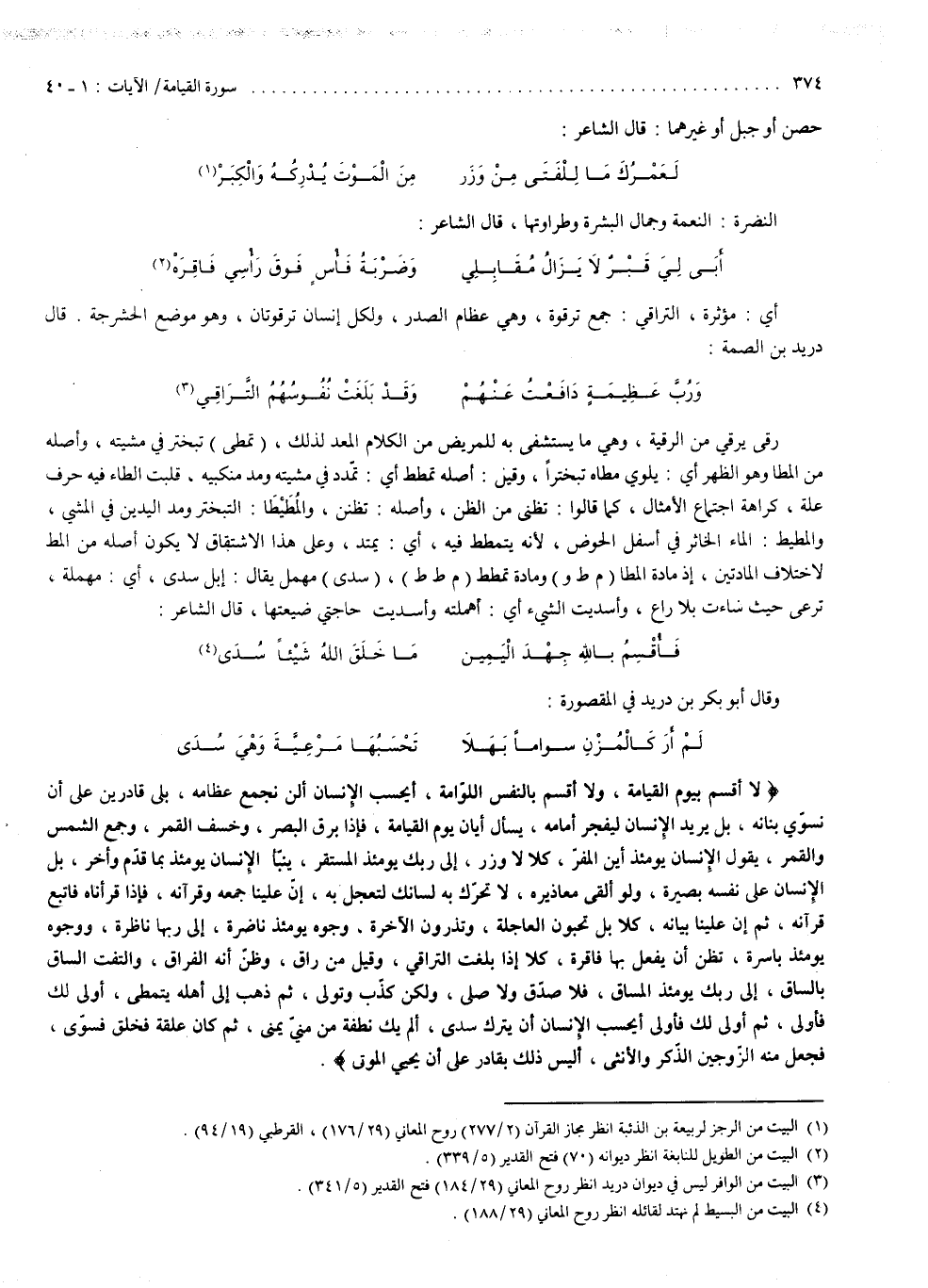 ) لاَ أُقْسِمُ بِيَوْمِ الْقِيَامَةِ وَلاَ أُقْسِمُ بِالنَّفْسِ اللَّوَّامَةِ أَيَحْسَبُ الإِنسَانُ أَلَّن نَّجْمَعَ عِظَامَهُ بَلَى قَادِرِينَ عَلَى أَن نُّسَوّىَ بَنَانَهُ بَلْ يُرِيدُ الإِنسَانُ لِيَفْجُرَ أَمَامَهُ يَسْئَلُ أَيَّانَ يَوْمُ الْقِيَامَةِ فَإِذَا بَرِقَ الْبَصَرُ وَخَسَفَ الْقَمَرُ وَجُمِعَ الشَّمْسُ وَالْقَمَرُ يَقُولُ الإِنسَانُ يَوْمَئِذٍ أَيْنَ الْمَفَرُّ كَلاَّ لاَ وَزَرَ إِلَى رَبّكَ يَوْمَئِذٍ الْمُسْتَقَرُّ يُنَبَّأُ الإِنسَانُ يَوْمَئِذِ بِمَا قَدَّمَ وَأَخَّرَ بَلِ الإِنسَانُ عَلَى نَفْسِهِ بَصِيرَةٌ وَلَوْ أَلْقَى مَعَاذِيرَهُ لاَ تُحَرّكْ بِهِ لِسَانَكَ لِتَعْجَلَ بِهِ إِنَّ عَلَيْنَا جَمْعَهُ وَقُرْءانَهُ فَإِذَا قَرَأْنَاهُ فَاتَّبِعْ قُرْءانَهُ ثُمَّ إِنَّ عَلَيْنَا بَيَانَهُ كَلاَّ بَلْ تُحِبُّونَ الْعَاجِلَةَ وَتَذَرُونَ الاْخِرَةَ وُجُوهٌ يَوْمَئِذٍ نَّاضِرَةٌ إِلَى رَبّهَا نَاظِرَةٌ وَوُجُوهٌ يَوْمَئِذٍ بَاسِرَةٌ تَظُنُّ أَن يُفْعَلَ بِهَا فَاقِرَةٌ كَلاَّ إِذَا بَلَغَتِ التَّرَاقِىَ وَقِيلَ مَنْ رَاقٍ وَظَنَّ أَنَّهُ الْفِرَاقُ وَالْتَفَّتِ السَّاقُ بِالسَّاقِ إِلَى رَبّكَ يَوْمَئِذٍ الْمَسَاقُ فَلاَ صَدَّقَ وَلاَ صَلَّى وَلَاكِن كَذَّبَ وَتَوَلَّى ثُمَّ ذَهَبَ إِلَى أَهْلِهِ يَتَمَطَّى أَوْلَى لَكَ فَأَوْلَى ثُمَّ أَوْلَى لَكَ فَأَوْلَى أَيَحْسَبُ الإِنسَانُ أَن يُتْرَكَ سُدًى أَلَمْ يَكُ نُطْفَةً مّن مَّنِىّ يُمْنَى ثُمَّ كَانَ عَلَقَةً فَخَلَقَ فَسَوَّى فَجَعَلَ مِنْهُ الزَّوْجَيْنِ الذَّكَرَ وَالاْنثَى أَلَيْسَ ذَلِكَ بِقَادِرٍ عَلَى أَن يُحْيِىَ الْمَوْتَى ).