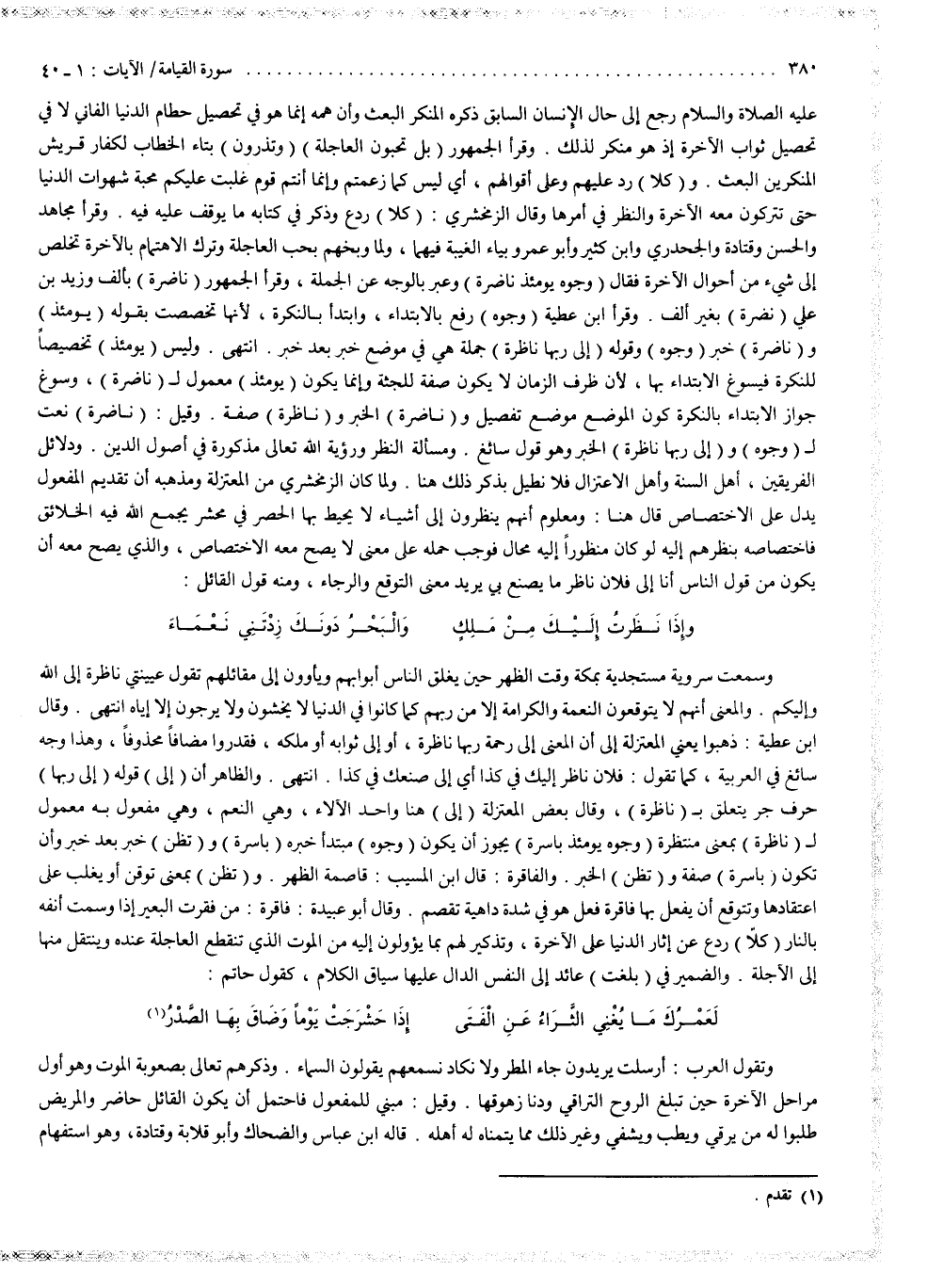 ولما وبخهم بحب العاجلة وترك الاهتمام بالآخرة ، تخلص إلى شيء من أحوال الآخرة فقال : ) وُجُوهٌ يَوْمَئِذٍ نَّاضِرَةٌ ( ، وعبر بالوجه عن الجملة . وقرأ الجمهور : ) نَّاضِرَةٌ ( بألف ، وزيد بن علي : نضرة بغير ألف . وقرأ ابن عطية : ) وُجُوهِ ( رفع بالابتداء ، وابتدأ بالنكرة لأنها تخصصت بقوله : ) يَوْمَئِذٍ ( و ) نَّاضِرَةٌ ( خبر ) وُجُوهِ ). وقوله : ) إِلَى رَبّهَا نَاظِرَةٌ ( جملة هي في موضع خبر بعد خبر . انتهى . وليس ) يَوْمَئِذٍ ( تخصيصاً للنكرة ، فيسوغ الابتداء بها ، لأن ظرف الزمان لا يكون صفة للجثة ، إنما يكون ) يَوْمَئِذٍ ( معمول لناضرة . وسوغ جواز الابتداء بالنكرة كون الموضع موضع تفصيل ، و ) نَّاضِرَةٌ ( الخبر ، و ) نَّاضِرَةٌ ( صفة . وقيل : ) نَّاضِرَةٌ ( نعت لوجوه ، و ) إِلَى رَبّهَا نَاظِرَةٌ ( الخبر ، وهو قول سائغ . ومسألة النظر ورؤية الله تعالى مذكورة في أصول الدين ودلائل الفريقين ، أهل السنة وأهل الاعتزال ، فلا نطيل بذكر ذلك هنا . ولما كان الزمخشري من المعتزلة ، ومذهبه أن تقديم المفعول يدل على الاختصاص ، قال هنا : ومعلوم أنهم ينظرون إلى أشياء لا يحيط بها الحصر في محشر يجمع الله فيه الخلائق ، فاختصاصه بنظرهم إليه لو كان منظوراً إليه محال ، فوجب حمله على معنى لا يصح معه الاختصاص ، والذي يصح معه أن يكون من قول الناس : أنا إلى فلان ناظر ما يصنع بي ، يريد معنى التوقع والرجاء ، ومنه قول القائل : وإذا نظرت إليك من ملك