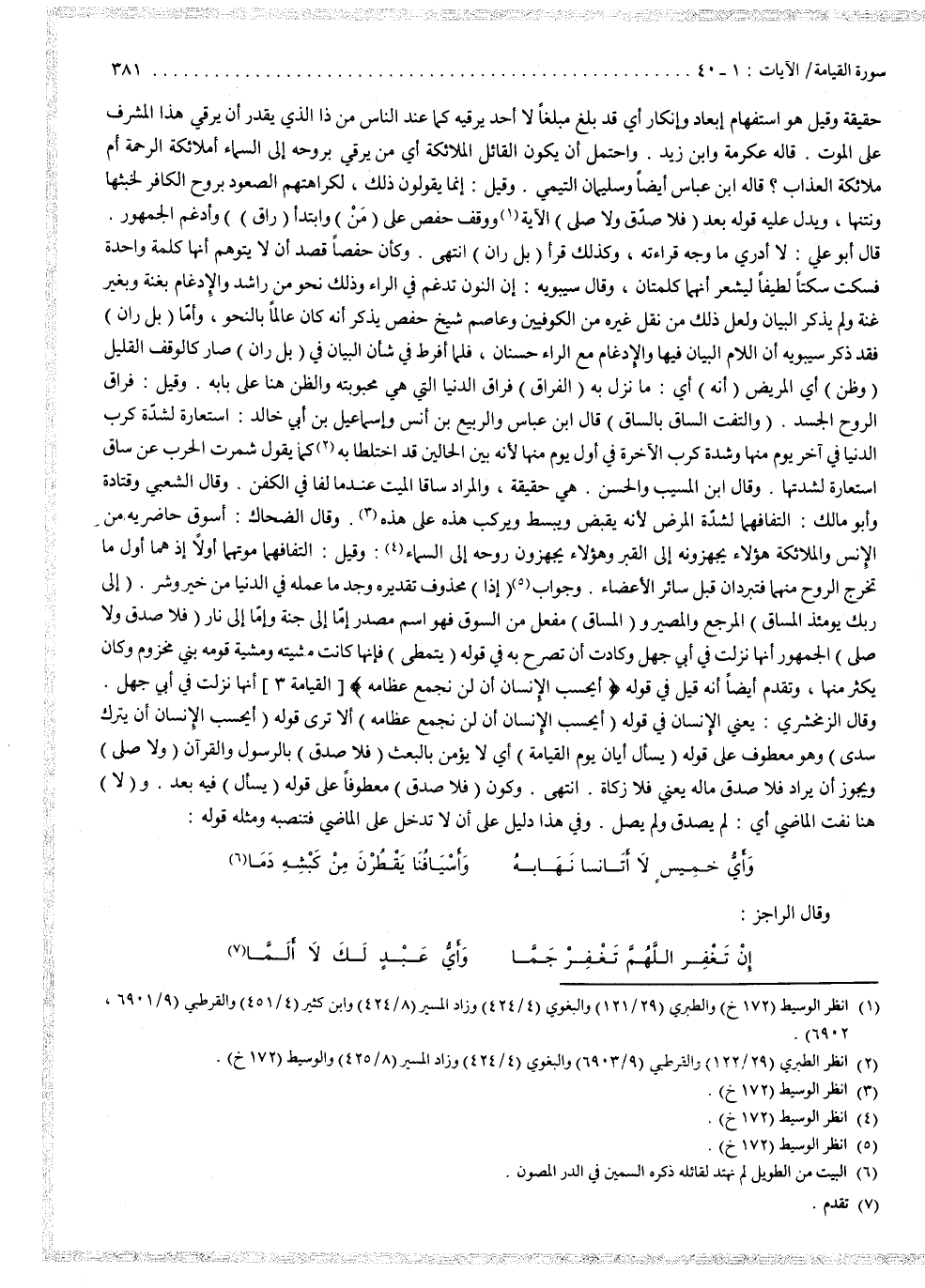 ) وَالْتَفَّتِ السَّاقُ بِالسَّاقِ ( ، قال ابن عباس والربيع بن أنس وإسماعيل بن أبي خالد : استعارة لشدّة كرب الدنيا في آخر يوم منها ، وشدة كرب الآخرة في أول يوم منها ، لأنه بين الحالين قد اختلطا به ، كما يقول : شمرت الحرب عن ساق ، استعارة لشدتها . وقال ابن المسيب والحسن : هي حقيقة ، والمراد ساقا الميت عندما لفا في الكفن . وقال الشعبي وقتادة وأبو مالك : التفافهما لشدّة المرض ، لأنه يقبض ويبسط ويركب هذه على هذه . وقال الضحاك : أسوق حاضريه من الإنس والملائكة ؛ هؤلاء يجهزونه إلى القبر ، وهؤلاء يجهزون روحه إلى السماء . وقيل : التفافهما : موتهما أولاً ، إذ هما أول ما تخرج الروح منهما فتبردان قبل سائر الأعضاء . وجواب إذا محذوف تقديره وجد ما عمله في الدنيا من خير وشر .