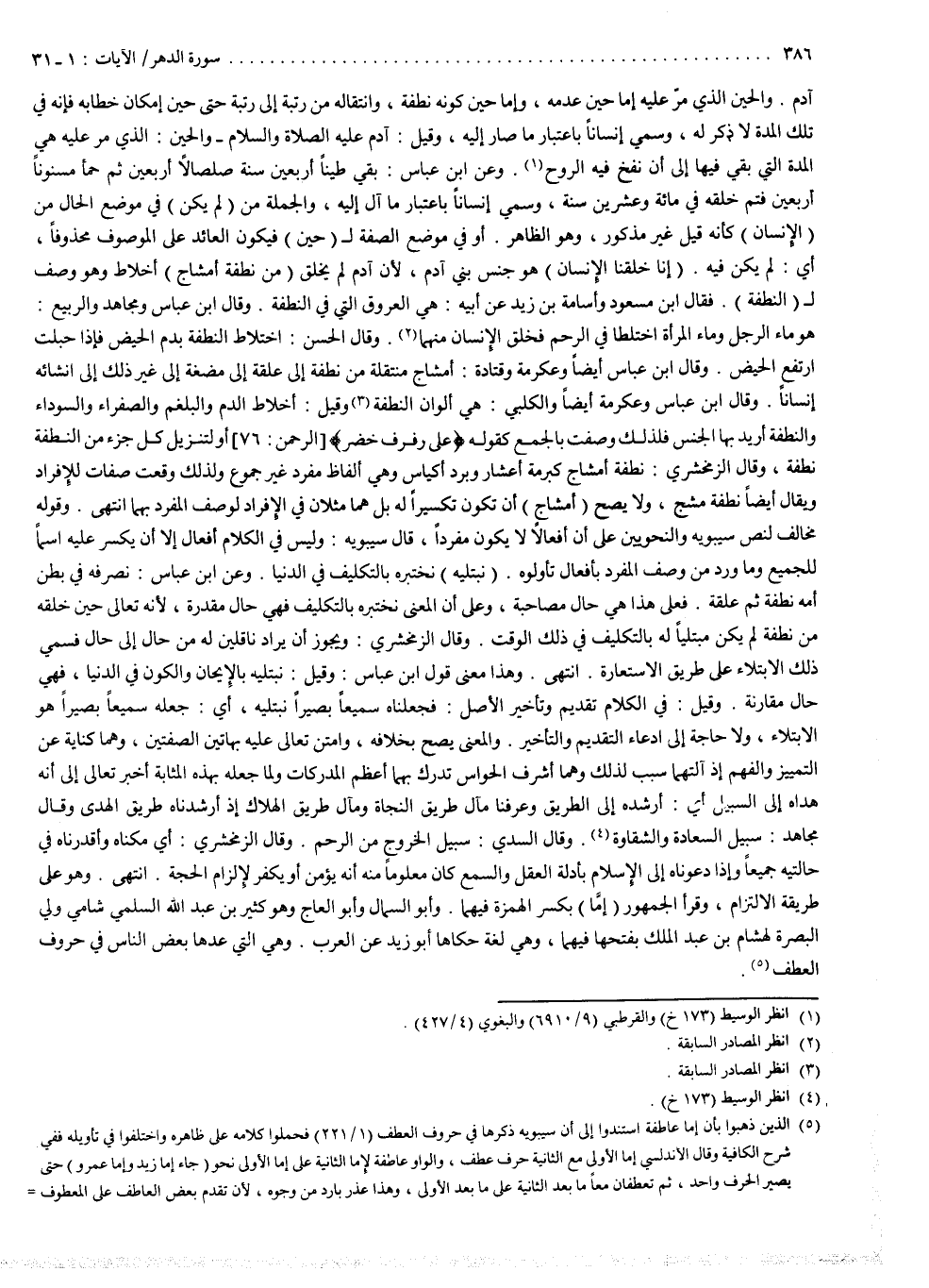 ( إِنَّا خَلَقْنَا الإِنسَانَ ( : هو جنس بني آدم لأن آدم لم يخلق ) مِن نُّطْفَةٍ أَمْشَاجٍ ( : أخلاط ، وهو وصف للنطفة . فقال ابن مسعود وأسامة بن زيد عن أبيه : هي العروق التي في النطفة . وقال ابن عباس ومجاهد والربيع : هو ماء الرجل وماء المرأة اختلطا في الرحم فخلق الإنسان منهما . وقال الحسن : اختلاط النطفة بدم الحيض ، فإذا حبلت ارتفع الحيض . وقال ابن عباس أيضاً وعكرمة وقتادة : أمشاج منتقلة من نطفة إلى علقة إلى مضغة إلى غير ذلك إلى إنشائه إنساناً . وقال ابن عباس أيضاً والكلبي : هي ألوان النطفة . وقيل : أخلاط الدم والبلغم والصفراء والسوداء ، والنطفة أريد بها الجنس ، فلذلك وصفت بالجمع كقوله : ) عَلَى رَفْرَفٍ خُضْرٍ ( ، أو لتنزيل كل جزء من النطفة نطفة . وقال الزمخشري : نطفة أمشاج ، كبرمة إعسار ، وبرد أكياس ، وهي ألفاظ مفرد غير جموع ، ولذلك وقعت صفات للأفراد . ويقال أيضاً : نطفة مشج ، ولا يصح أمشاج أن تكون تكسيراً له ، بل هما مثلان في الإفراد لوصف المفرد بهما . انتهى . وقوله مخالف لنص سيبويه والنحويين على أن أفعالاً لا يكون مفرداً . قال سيبويه : وليس في الكلام أفعال إلا أن يكسر عليه اسماً للجميع ، وما ورد من وصف المفرد بأفعال تأولوه . ) نَّبْتَلِيهِ ( : نختبره بالتكليف في الدنيا ؛ وعن ابن عباس : نصرفه في بطن أمه نطفة ثم علقة ، فعلى هذا هي حال مصاحبة ، وعلى أن المعنى نختبره بالتكليف ، فهي حال مقدرة لأنه تعالى حين خلقه من نطفة لم يكن مبتلياً له بالتكليف في ذلك الوقت . وقال الزمخشري : ويجوز أن يراد ناقلين له من حال إلى حال فسمي ذلك الابتلاء على طريق الاستعارة . انتهى . وهذا معنى قول ابن عباس . وقيل : نبتليه بالإيحان والكون في الدنيا ، فهي حال مقارنة . وقيل : في الكلام تقديم وتأخير الأصل . ) فَجَعَلْنَاهُ سَمِيعاً بَصِيراً ( نبتليه ، أي جعله سميعاً بصيراً هو الابتلاء ، ولا حاجة إلى ادعاء التقديم والتأخير ، والمعنى يصح بخلافه ، وامتن تعالى عليه بجعله بهاتين الصفتين ، وهما كناية عن التمييز والفهم ، إذ آلتهما سبب لذلك ، وهما أشرف الحواس ، تدرك بهما أعظم المدركات .