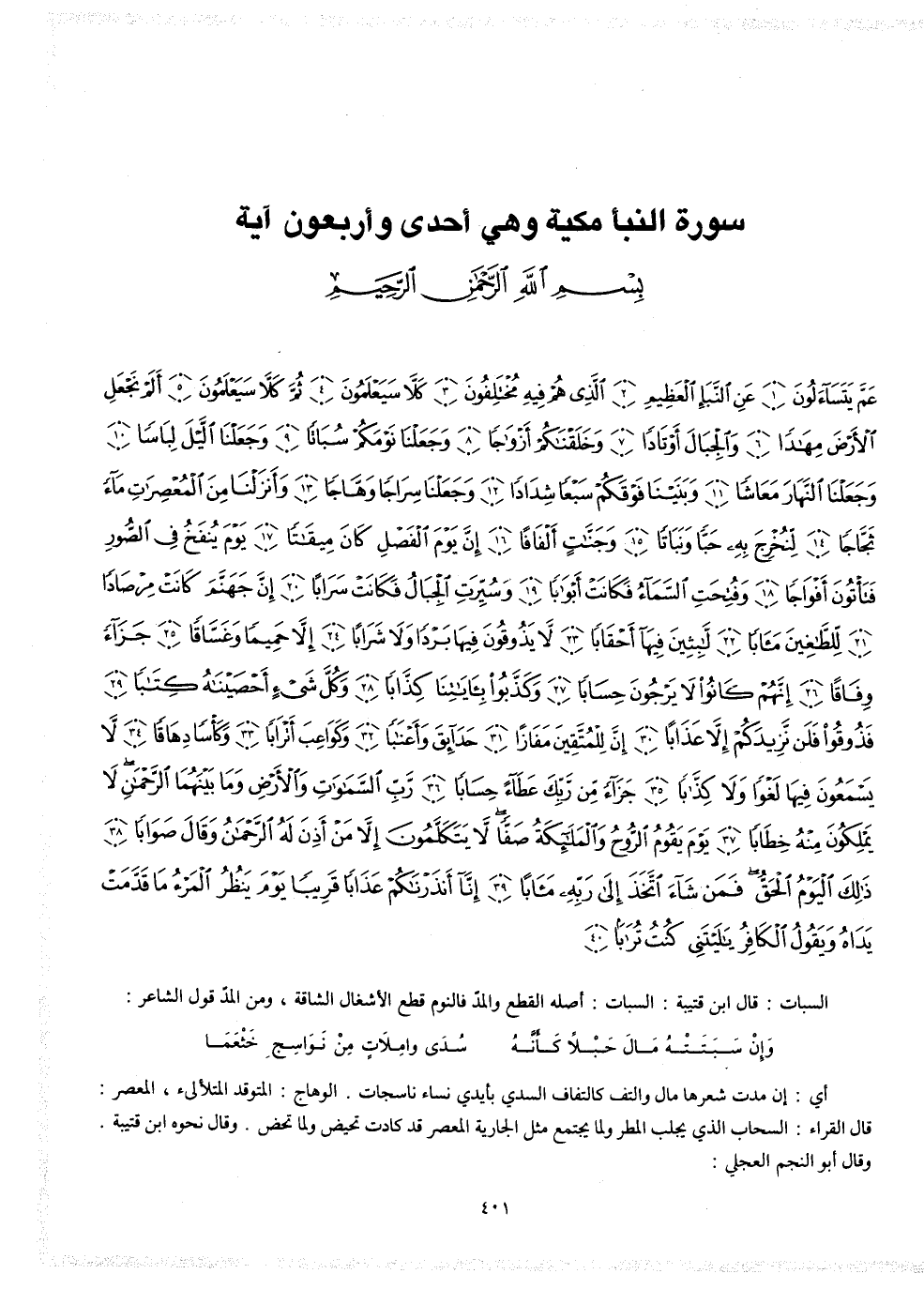 2 ( ) عَمَّ يَتَسَآءَلُونَ عَنِ النَّبَإِ الْعَظِيمِ الَّذِى هُمْ فِيهِ مُخْتَلِفُونَ كَلاَّ سَيَعْلَمُونَ ثُمَّ كَلاَّ سَيَعْلَمُونَ أَلَمْ نَجْعَلِ الاٌّ رْضَ مِهَاداً وَالْجِبَالَ أَوْتَاداً وَخَلَقْنَاكُمْ أَزْوَاجاً وَجَعَلْنَا نَوْمَكُمْ سُبَاتاً وَجَعَلْنَا الَّيْلَ لِبَاساً وَجَعَلْنَا النَّهَارَ مَعَاشاً وَبَنَيْنَا فَوْقَكُمْ سَبْعاً شِدَاداً وَجَعَلْنَا سِرَاجاً وَهَّاجاً وَأَنزَلْنَا مِنَ الْمُعْصِرَاتِ مَآءً ثَجَّاجاً لِّنُخْرِجَ بِهِ حَبّاً وَنَبَاتاً وَجَنَّاتٍ أَلْفَافاً إِنَّ يَوْمَ الْفَصْلِ كَانَ مِيقَاتاً يَوْمَ يُنفَخُ فِى الصُّورِ فَتَأْتُونَ أَفْوَاجاً وَفُتِحَتِ السَّمَآءُ فَكَانَتْ أَبْوَاباً وَسُيِّرَتِ الْجِبَالُ فَكَانَتْ سَرَاباً إِنَّ جَهَنَّمَ كَانَتْ مِرْصَاداً لِّلطَّاغِينَ مَأاباً لَّابِثِينَ فِيهَآ أَحْقَاباً لاَّ يَذُوقُونَ فِيهَا بَرْداً وَلاَ شَرَاباً إِلاَّ حَمِيماً وَغَسَّاقاً جَزَآءً وِفَاقاً إِنَّهُمْ كَانُواْ لاَ يَرْجُونَ حِسَاباً وَكَذَّبُواْ بِأايَاتِنَا كِذَّاباً وَكُلَّ شَىْءٍ أَحْصَيْنَاهُ كِتَاباً فَذُوقُواْ فَلَن نَّزِيدَكُمْ إِلاَّ عَذَاباً إِنَّ لِلْمُتَّقِينَ مَفَازاً حَدَآئِقَ وَأَعْنَاباً وَكَوَاعِبَ أَتْرَاباً وَكَأْساً دِهَاقاً لاَّ يَسْمَعُونَ فِيهَا لَغْواً وَلاَ كِذَاباً جَزَآءً مِّن رَّبِّكَ عَطَآءً حِسَاباً رَّبِّ السَّمَاوَاتِ وَالاٌّ رْضِ وَمَا بَيْنَهُمَا الرَّحْمَنِ لاَ يَمْلِكُونَ مِنْهُ خِطَاباً يَوْمَ يَقُومُ الرُّوحُ وَالْمَلَائِكَةُ صَفّاً لاَّ يَتَكَلَّمُونَ إِلاَّ مَنْ أَذِنَ لَهُ الرَّحْمَنُ وَقَالَ صَوَاباً ذَلِكَ الْيَوْمُ الْحَقُّ فَمَن شَآءَ اتَّخَذَ إِلَى رَبِّهِ مَأاباً إِنَّآ أَنذَرْنَاكُمْ عَذَاباً قَرِيباً يَوْمَ يَنظُرُ الْمَرْءُ مَا قَدَّمَتْ يَدَاهُ وَيَقُولُ الْكَافِرُ يَالَيْتَنِى كُنتُ تُرَاباً ( ) ) 2