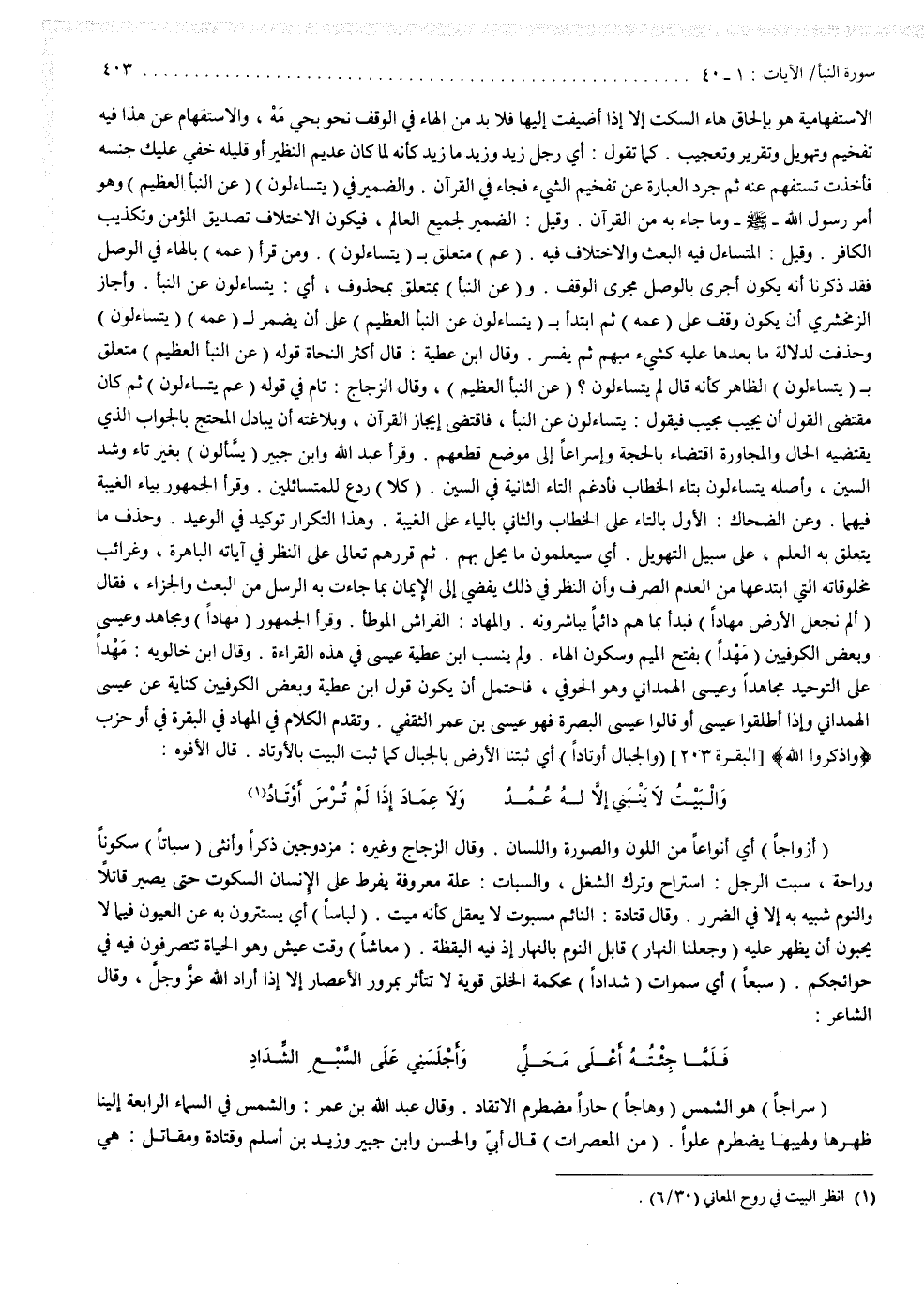 الاستفهامية هو بإلحاق هاء السكت ، إلا إذا أضيفت إليها فلا بد من الهاء في الوقف ، نحو : بحي مه . والاستفهام عن هذا فيه تفخيم وتهويل وتقرير وتعجيب ، كما تقول : أي رجل زيد ؟ وزيد ما زيد ، كأنه لما كان عديم النظير أو قليله خفيّ عليك جنسه فأخذت تستفهم عنه . ثم جرد العبارة عن تفخيم الشيء ، فجاء في القرآن ، والضمير في ) يَتَسَاءلُونَ ( لأهل مكة . ثم أخبر تعالى أنهم ) يَتَسَاءلُونَ عَنِ النَّبَإِ الْعَظِيمِ ( ، وهو أمر رسول الله ( صلى الله عليه وسلم ) ) ، وما جاء به من القرآن . وقيل : الضمير لجميع العالم ، فيكون الاختلاف تصديق المؤمن وتكذيب الكافر . وقيل : المتسأل فيه البعث ، والاختلاف فيه عم متعلق بيتساءلون . ومن قرأ عمه بالهاء في الوصل فقد ذكرنا أنه يكون أجرى الوصل مجرى الوقف ، وعن النبأ متعلق بمحذوف ، أي يتساءلون عن النبأ . وأجاز الزمخشري أن يكون وقف على عمه ، ثم ابتدأ بيتسألون عن النبأ العظيم على أن يضمر لعمه يتساءلون ، وحذفت لدلالة ما بعدها عليه ، كشيء مبهم ثم يفسر . وقال ابن عطية : قال أكثر النحاة قوله ) عَنِ النَّبَإِ الْعَظِيمِ ( متعلق بيتساءلون ، الظاهر كأنه قال : لم يتساءلون عن النبأ العظيم ؟ وقال الزجاج : الكلام تام في قوله ) عَمَّ يَتَسَاءلُونَ ( ، ثم كان مقتضى القول أن يجيب مجيب فيقول : يتساءلون عن النبأ ، فاقتضى إيجاز القرآن وبلاغته أن يبادر المحتج بالجواب الذي يقتضيه الحال ، والمجاورة اقتضاء بالحجة وإسراعاً إلى موضع قطعهم . وقرأ عبد الله وابن جبير : يسألون بغير تاء وشد السين ، وأصله يتساءلون بتاء الخطاب ، فأدغم التاء الثانية في السين .