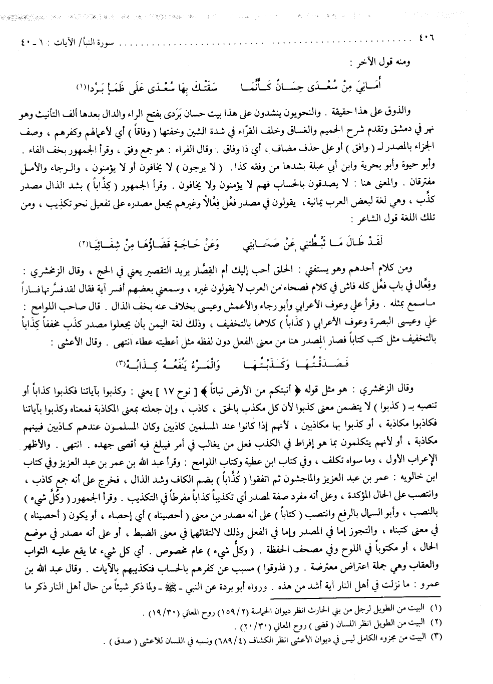 وقال الزمخشري : هو مثل قوله : ) أَنبَتَكُمْ مّنَ الاْرْضِ نَبَاتاً ( يعني : وكذبوا بآياتنا فكذبوا كذاباً ، أو تنصبه بكذبوا لا يتضمن معنى كذبوا ، لأن كل مكذب بالحق كاذب ؛ وإن جعلته بمعنى المكاذبة فمعناه : وكذبوا بآياتنا فكاذبوا مكاذبة ، أو كذبوا بها مكاذبين لأنهم إذا كانوا عند المسلمين كاذبين وكان المسلمون عندهم كاذبين فبينهم مكاذبة ، أو لأنهم يتكلمون بما هو إفراط في الكذب ، فعل من يغالب في أمر فيبلغ فيه أقصى جهده . انتهى . والأظهر الإعراب الأول وما سواه تكلف ، وفي كتاب ابن عطية وكتاب اللوامح . وقرأ عبد الله بن عمر بن عبد العزيز : وفي كتاب ابن خالويه عمر بن عبد العزيز والماجشون ، ثم اتفقوا كذاباً بضم الكاف وشد الذال ، فخرج على أنه جمع كاذب وانتصب على الحال المؤكدة ، وعلى أنه مفرد صفة لمصدر ، أي تكذيباً كذاباً مفرطاً في التكذيب .