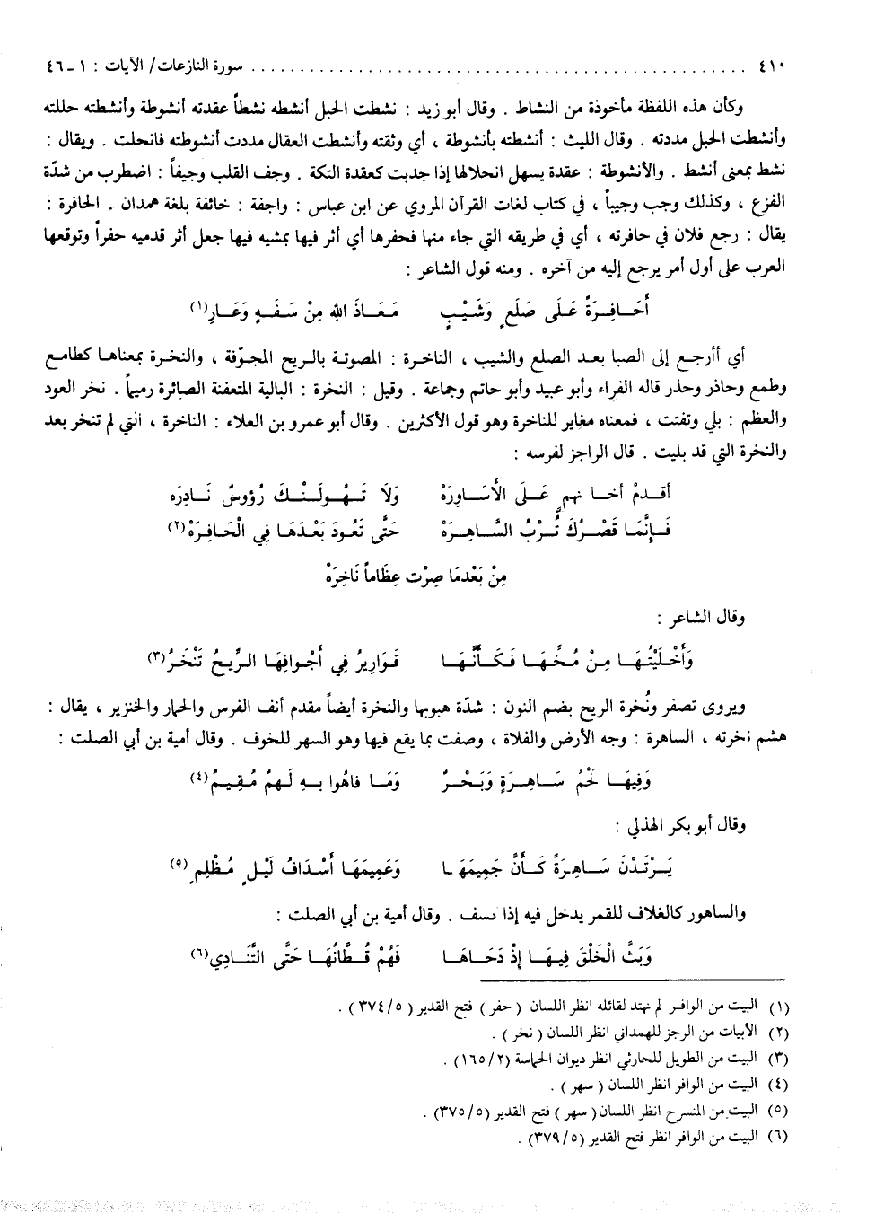 وكأن هذه اللفظة مأخوذة من النشاط . وقال أبو زيد : نشطت الحبل أنشطه نشطاً : عقدته أنشوطة ، وأنشطته : حللته ، وأنشطت الحبل : مددته . وقال الليث : أنشطته بأنشوطة : أي وثقته ، وأنشطت العقال : مددت أنشوطته فانحلت ، ويقال : نشط بمعنى أنشط ، والأنشوطة : عقدة يسهل إنحلالها إذا جدبت كعقدة التكة . وجف القلب وجيفاً : اضطرب من شدّة الفزع ، وكذلك وجب وجيباً . وفي كتاب لغات القرآن المروي عن ابن عباس ، واجفة : خائفة ، بلغة همدان . الحافرة ، يقال : رجع فلان في حافرته : أي في طريقه التي جاء منها ، فحفرها : أي أثر فيها بمشيه فيها ، جعل أثر قدميه حفراً ، وتوقعها العرب على أول أمر يرجع إليه من آخره ، ومنه قول الشاعر : أحافرة على صلع وشيب