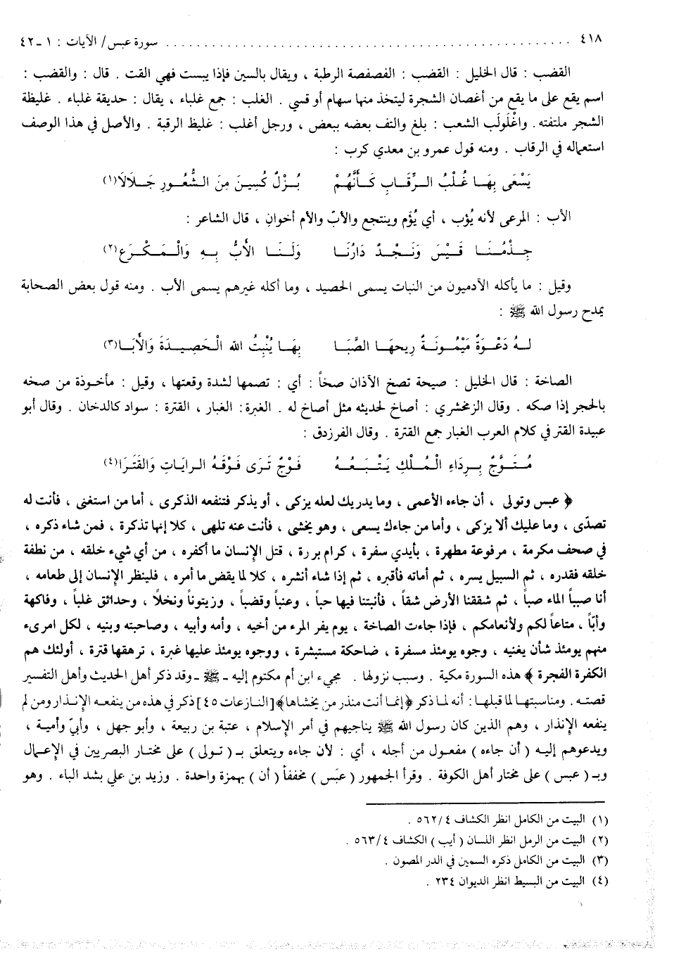 ) عَبَسَ وَتَوَلَّى أَن جَاءهُ الاْعْمَى وَمَا يُدْرِيكَ لَعَلَّهُ يَزَّكَّى أَوْ يَذَّكَّرُ فَتَنفَعَهُ الذّكْرَى أَمَّا مَنِ اسْتَغْنَى فَأَنتَ لَهُ تَصَدَّى وَمَا عَلَيْكَ أَلاَّ يَزَّكَّى وَأَمَّا مَن جَاءكَ يَسْعَى وَهُوَ يَخْشَى فَأَنتَ عَنْهُ تَلَهَّى كَلاَّ إِنَّهَا تَذْكِرَةٌ فَمَن شَاء ذَكَرَهُ فَى صُحُفٍ مُّكَرَّمَةٍ مَّرْفُوعَةٍ مُّطَهَّرَةٍ بِأَيْدِى سَفَرَةٍ كِرَامٍ بَرَرَةٍ قُتِلَ الإِنسَانُ مَا أَكْفَرَهُ مِنْ أَىّ شَىْء خَلَقَهُ مِن نُّطْفَةٍ خَلَقَهُ فَقَدَّرَهُ ثُمَّ السَّبِيلَ يَسَّرَهُ ثُمَّ أَمَاتَهُ فَأَقْبَرَهُ ثُمَّ إِذَا شَاء أَنشَرَهُ كَلاَّ لَمَّا يَقْضِ مَا أَمَرَهُ فَلْيَنظُرِ الإِنسَانُ إِلَى طَعَامِهِ أَنَّا صَبَبْنَا الْمَاء صَبّاً ثُمَّ شَقَقْنَا الاْرْضَ شَقّاً فَأَنبَتْنَا فِيهَا حَبّاً وَعِنَباً وَقَضْباً وَزَيْتُوناً وَنَخْلاً وَحَدَائِقَ غُلْباً وَفَاكِهَةً وَأَبّاً مَتَاعاً لَّكُمْ وَلاِنْعَامِكُمْ فَإِذَا جَاءتِ الصَّاخَّةُ يَوْمَ يَفِرُّ الْمَرْء مِنْ أَخِيهِ وَأُمّهِ وَأَبِيهِ وَصَاحِبَتِهُ وَبَنِيهِ لِكُلّ امْرِىء مّنْهُمْ يَوْمَئِذٍ شَأْنٌ يُغْنِيهِ وُجُوهٌ يَوْمَئِذٍ مُّسْفِرَةٌ ضَاحِكَةٌ مُّسْتَبْشِرَةٌ وَوُجُوهٌ يَوْمَئِذٍ عَلَيْهَا غَبَرَةٌ تَرْهَقُهَا قَتَرَةٌ أُوْلَئِكَ هُمُ الْكَفَرَةُ الْفَجَرَةُ ).