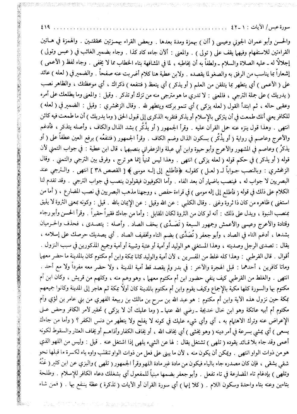 وقرأ الحسن وأبو رجاء وقتادة والأعرج وعيسى والأعمش وجمهور السبعة : ) تَصَدَّى ( بخف الصاد ، وأصله يتصدى فحذف ؛ والحرميان : بشدها ، أدغم التاء في الصاد ؛ وأبو جعفر : تصدى ، بضم التاء وتخفيف الصاد ، أي يصدك حرصك على إسلامه . يقال : تصدى الرجل وصديته ، وهذا المستغنى هو الوليد ، أو أمية ، أو عتبة وشيبة ، أو أمية وجميع المذكورين في سبب النزول ، أقوال . قال القرطبي : وهذا كله غلط من المفسرين ، لأنه أمية والوليد كانا بمكة ، وابن أم مكتوم كان بالمدينة ما حضر معهما ، وماتا كافرين ، أحدهما قبل الهجرة والآخر في بدر ، ولم يقصد قط أمية المدينة ، ولا حضر معه مفرداً ولا مع أحد . انتهى . والغلط من القرطبي ، كيف ينفي حضور ابن أم مكتوم معهما ؟ وهو وهم منه ، وكلهم من قريش ، وكان ابن أم مكتوم بها : والسورة كلها مكية بالإجماع . وكيف يقول : وابن أم مكتوم بالمدينة ؟ كان أولاً بمكة ، ثم هاجر إلى المدينة ، وكانوا جميعهم بمكة حين نزول هذه الآية . وابن أم مكتوم هو عبد الله بن سرح بن مالك بن ربيعة الفهري ، من بني عامر بن لؤي ، وأم مكتوم أم أبيه عاتكة ، وهو ابن خال خديجة رضي الله عنها .