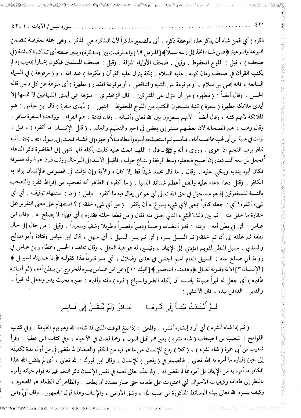) ثُمَّ السَّبِيلَ يَسَّرَهُ ( : أي ثم يسر السبيل ، أي سهل . قال ابن عباس وقتادة وأبو صالح والسدي : سبيل النظر القويم المؤدي إلى الإيمان ، وتيسيره له هو هبة العقل . وقال مجاهد والحسن وعطاء وابن عباس في رواية أبي صالح عنه : السبيل العام اسم الجنس في هدى وضلال ، أي يسر قوماً لهذا ، كقوله : ) إِنَّا هَدَيْنَاهُ السَّبِيلَ ( الآية ، وقوله تعالى : ) وَهَدَيْنَاهُ النَّجْدَينِ ( ؛ وعن ابن عباس : يسره للخروج من بطن أمه .