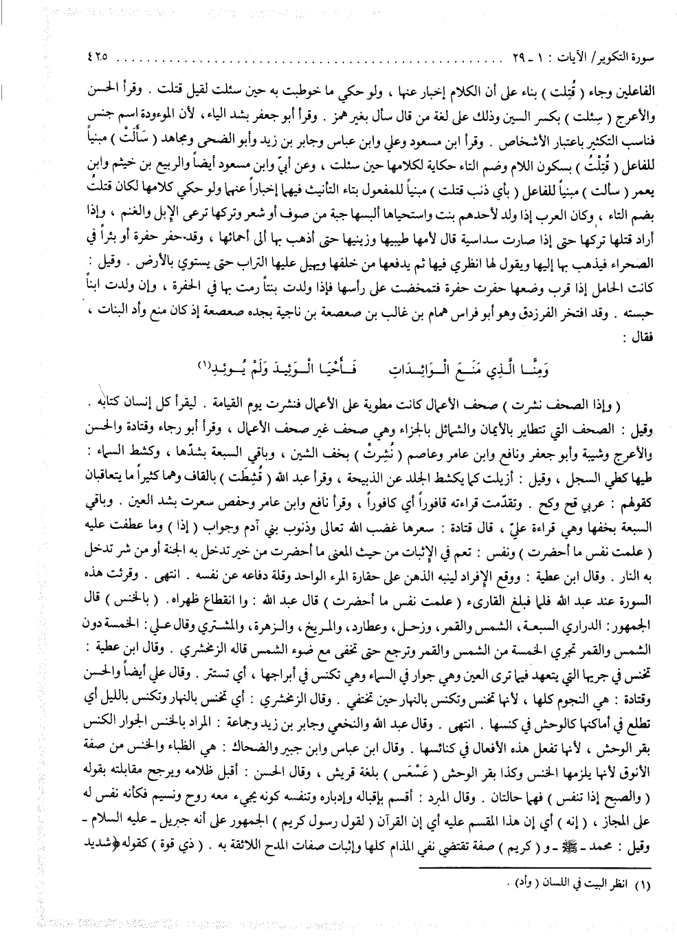 ) بِالْخُنَّسِ ( ، قال الجمهور : الدراري السبعة : الشمس والقمر ، وزحل ، وعطارد ، والمريخ ، والزهرة ، والمشتري . وقال : على الخمسة دون الشمس والقمر ، تجري الخمسة مع الشمس والقمر ، وترجع حتى تخفى مع ضوء الشمس ، قاله الزمخشري . وقال ابن عطية : تخنس في جريها التي يتعهد فيها ترى العين ، وهي جوار في السماء ، وهي تكنس في أبراجها ، أي تستتر . وقال علي أيضاً والحسن وقتادة : هي النجوم كلها لأنها تخنس وتكنس بالنهار حين تختفي . وقال الزمخشري : أي تخنس بالنهار وتكنس بالليل ، أي تطلع في أماكنها كالوحش في كنسها . انتهى . وقال عبد الله والنخعي وجابر بن زيد وجماعة : المراد ) بِالْخُنَّسِ الْجَوَارِ الْكُنَّسِ ( : بقر الوحش ، لأنها تفعل هذه الأفعال في كنائسها . وقال ابن عباس وابن جبير والضحاك : هي الظباء ، والخنس من صفة الأنوق لأنها يلزمها الخنس ، وكذا بقر الوحش .