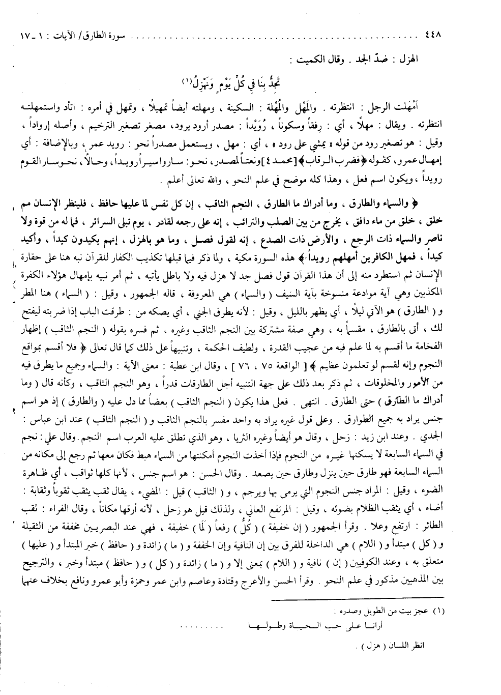 هذه السورة مكية ، ولما ذكر فيما قبلها تكذيب الكفار للقرآن ، نبه هنا على حقارة الإنسان ، ثم استطرد منه إلى أن هذا القرآن قول فصل جد ، لا هزل فيه ولا باطل يأتيه . ثم أمر نبيه بإمهال هؤلاء الكفرة المكذبين ، وهي آية موادعة منسوخة بآية السيف . ) وَالسَّمَاء ( : هي المعروفة ، قاله الجمهور . وقيل : السماء هنا المطر ، ( وَالطَّارِقِ ( : هو الآتي ليلاً ، أي يظهر بالليل . وقيل : لأنه يطرق الجني ، أي يصكه ، من طرقت الباب إذا ضربته ليفتح لك . أتى بالطارق مقسماً به ، وهي صفة مشتركة بين النجم الثاقب وغيره .