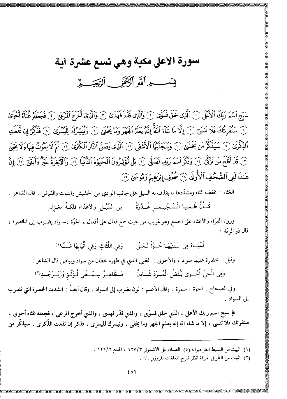 2 ( ) سَبِّحِ اسْمَ رَبِّكَ الاّعْلَى الَّذِى خَلَقَ فَسَوَّى وَالَّذِى قَدَّرَ فَهَدَى وَالَّذِىأَخْرَجَ الْمَرْعَى فَجَعَلَهُ غُثَآءً أَحْوَى سَنُقْرِئُكَ فَلاَ تَنسَى إِلاَّ مَا شَآءَ اللَّهُ إِنَّهُ يَعْلَمُ الْجَهْرَ وَمَا يَخْفَى وَنُيَسِّرُكَ لِلْيُسْرَى فَذَكِّرْ إِن نَّفَعَتِ الذِّكْرَى سَيَذَّكَّرُ مَن