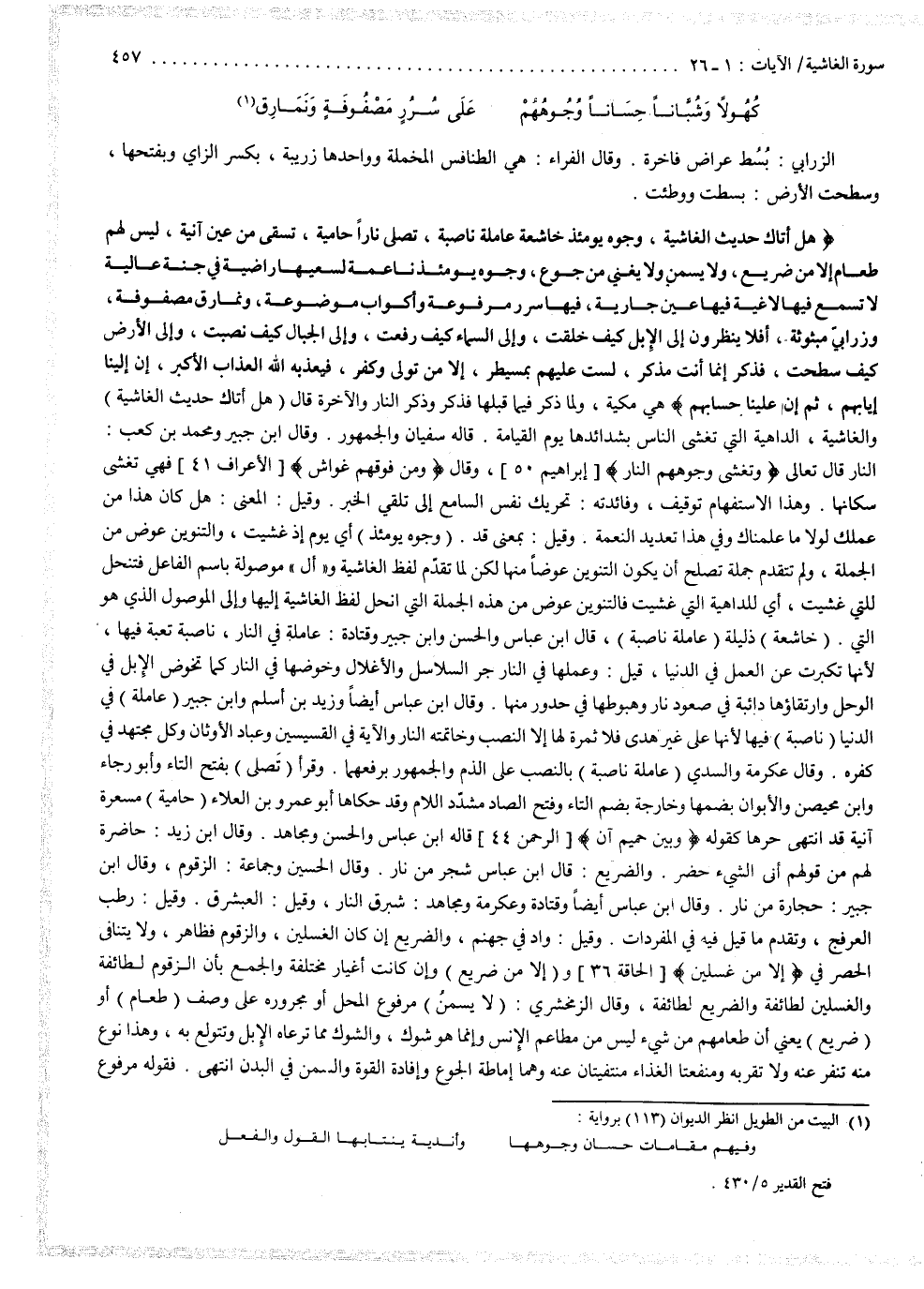 ( هَلْ أَتَاكَ حَدِيثُ الْغَاشِيَةِ وُجُوهٌ يَوْمَئِذٍ خَاشِعَةٌ عَامِلَةٌ نَّاصِبَةٌ تَصْلَى نَاراً حَامِيَةً تُسْقَى مِنْ عَيْنٍ ءانِيَةٍ لَّيْسَ لَهُمْ طَعَامٌ إِلاَّ مِن ضَرِيعٍ لاَّ يُسْمِنُ وَلاَ يُغْنِى مِن جُوعٍ وُجُوهٌ يَوْمَئِذٍ نَّاعِمَةٌ لِّسَعْيِهَا رَاضِيَةٌ فِى جَنَّةٍ عَالِيَةٍ لاَّ تَسْمَعُ فِيهَا لَاغِيَةً فِيهَا عَيْنٌ جَارِيَةٌ فِيهَا سُرُرٌ مَّرْفُوعَةٌ وَأَكْوَابٌ مَّوْضُوعَةٌ وَنَمَارِقُ مَصْفُوفَةٌ وَزَرَابِيُّ مَبْثُوثَةٌ أَفَلاَ يَنظُرُونَ إِلَى الإبِلِ كَيْفَ خُلِقَتْ وَإِلَى السَّمَاء كَيْفَ رُفِعَتْ وَإِلَى الْجِبَالِ كَيْفَ نُصِبَتْ وَإِلَى الاْرْضِ كَيْفَ سُطِحَتْ فَذَكّرْ إِنَّمَا أَنتَ مُذَكّرٌ لَّسْتَ عَلَيْهِم بِمُسَيْطِرٍ إِلاَّ مَن تَوَلَّى وَكَفَرَ فَيْعَذّبُهُ اللَّهُ الْعَذَابَ الاْكْبَرَ إِنَّ إِلَيْنَا إِيَابَهُمْ ثُمَّ إِنَّ عَلَيْنَا حِسَابَهُمْ ).