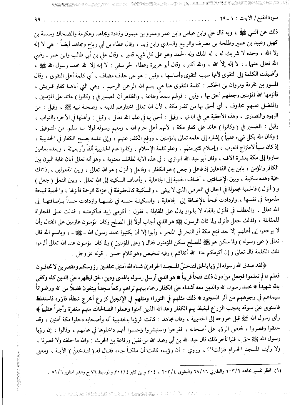 ) لَّقَدْ صَدَقَ اللَّهُ رَسُولَهُ الرُّؤْيَا بِالْحَقّ لَتَدْخُلُنَّ الْمَسْجِدَ الْحَرَامَ إِن شَاء اللَّهُ ءامِنِينَ مُحَلّقِينَ رُءوسَكُمْ وَمُقَصّرِينَ لاَ تَخَافُونَ فَعَلِمَ مَا لَمْ تَعْلَمُواْ فَجَعَلَ مِن دُونِ ذَلِكَ فَتْحاً قَرِيباً هُوَ الَّذِى أَرْسَلَ رَسُولَهُ بِالْهُدَى وَدِينِ الْحَقّ لِيُظْهِرَهُ عَلَى الدّينِ كُلّهِ وَكَفَى بِاللَّهِ شَهِيداً مُّحَمَّدٌ رَّسُولُ اللَّهِ وَالَّذِينَ مَعَهُ أَشِدَّاء عَلَى الْكُفَّارِ رُحَمَاء بَيْنَهُمْ تَرَاهُمْ رُكَّعاً سُجَّداً يَبْتَغُونَ فَضْلاً مّنَ اللَّهِ وَرِضْوَاناً سِيمَاهُمْ ).