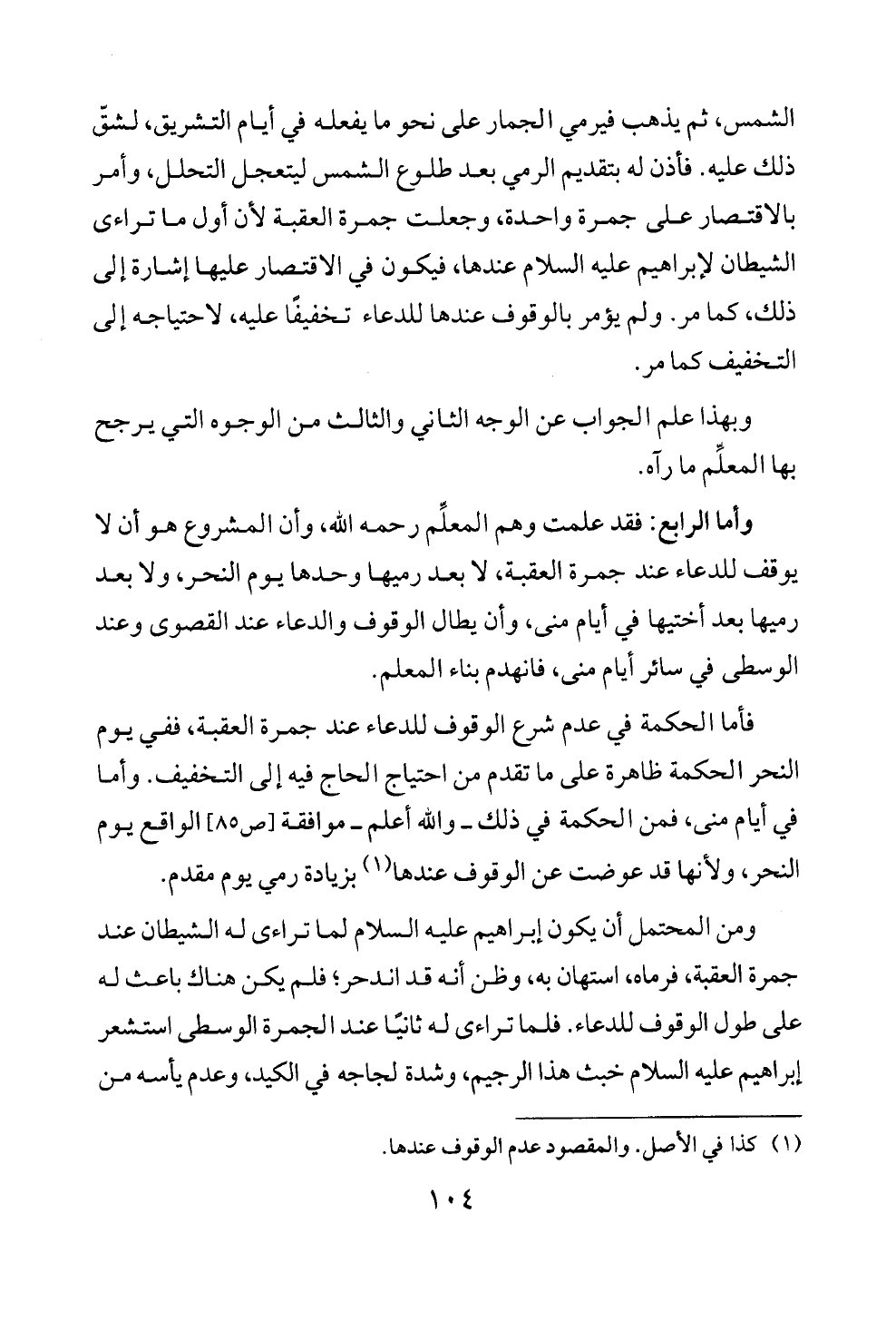 وأما الرابع: فقد علمت وهم المعلِّم رحمه الله، وأن المشروع هو أن لا يوقف للدعاء عند جمرة العقبة، لا بعد رميها وحدها يوم النحر، ولا بعد رميها بعد أختيها في أيام منى، وأن يطال الوقوف والدعاء عند القصوى وعند الوسطى في سائر أيام منى، فانهدم بناء المعلم.
