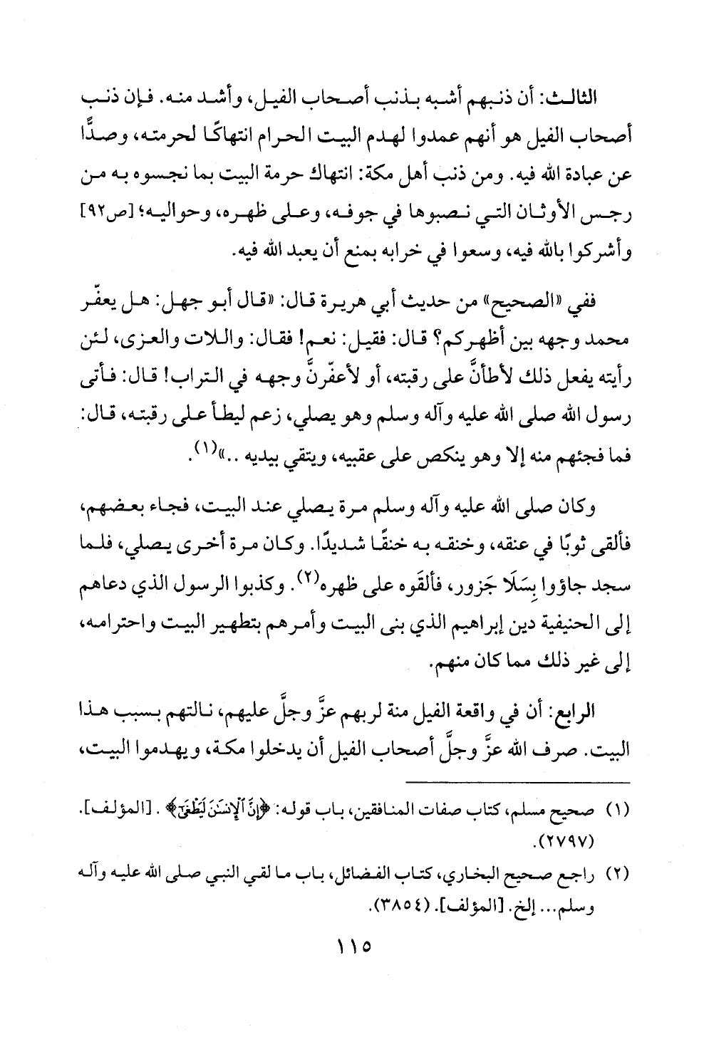 الثالث: أن ذنبهم أشبه بذنب أصحاب الفيل، وأشد منه. فإن ذنب أصحاب الفيل هو أنهم عمدوا لهدم البيت الحرام انتهاكًا لحرمته، وصدًّا عن عبادة الله فيه. ومن ذنب أهل مكة: انتهاك حرمة البيت بما نجسوه به من رجس الأوثان التي نصبوها في جوفه، وعلى ظهره، وحواليه؛ [ص ٩٢] وأشركوا بالله فيه، وسعوا في خرابه بمنع أن يعبد الله فيه.