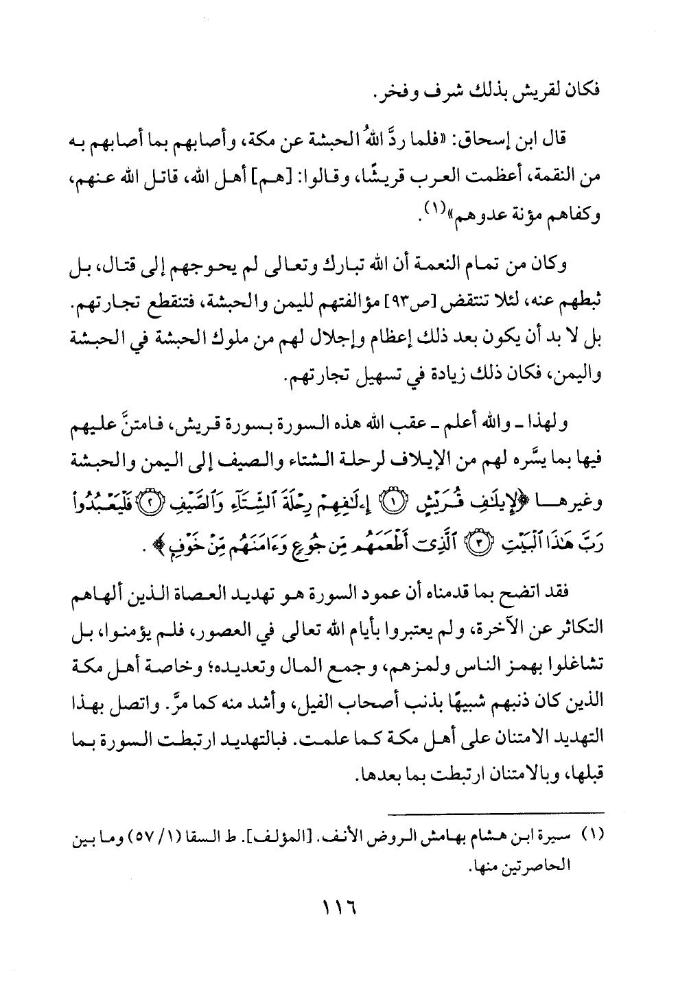 وكان من تمام النعمة أن الله تبارك وتعالى لم يحوجهم إلى قتال، بل ثبطهم عنه، لئلا تنتقض [ص ٩٣] مؤالفتهم لليمن والحبشة، فتنقطع تجارتهم. بل لا بد أن يكون بعد ذلك إعظام وإجلال لهم من ملوك الحبشة في الحبشة واليمن، فكان ذلك زيادة في تسهيل تجارتهم.