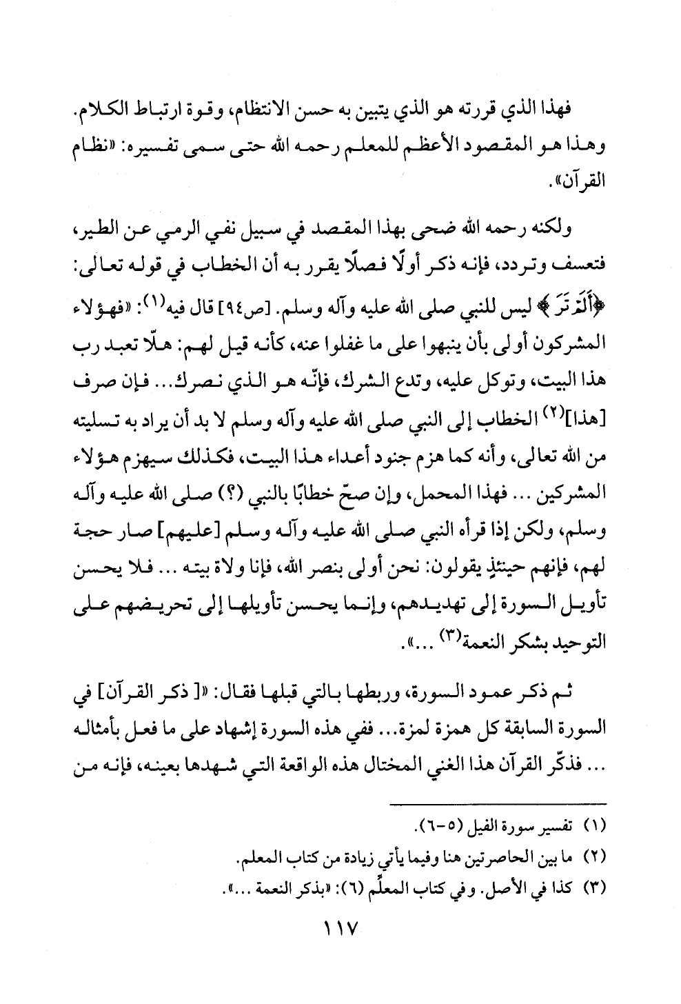 ولكنه رحمه الله ضحى بهذا المقصد في سبيل نفي الرمي عن الطير، فتعسف وتردد، فإنه ذكر أولًا فصلًا يقرر به أن الخطاب في قوله تعالى: {أَلَمْ تَرَ} ليس للنبي صلى الله عليه وآله وسلم. [ص ٩٤] قال فيه (¬١): "فهؤلاء المشركون أولى بأن ينبهوا على ما غفلوا عنه، كأنه قيل لهم: هلّا تعبد رب هذا البيت، وتوكل عليه، وتدع الشرك، فإنّه هو الذي نصرك ... فإن صرف [هذا] (¬٢) الخطاب إلى النبي صلى الله عليه وآله وسلم لا بد أن يراد به تسليته من الله تعالى، وأنه كما هزم جنود أعداء هذا البيت، فكذلك سيهزم هؤلاء المشركين ... فهذا المحمل، وإن صحّ خطابًا بالنبي (؟ ) صلى الله عليه وآله وسلم، ولكن إذا قرأه النبي صلى الله عليه وآله وسلم [عليهم] صار حجة لهم، فإنهم حينئذٍ يقولون: نحن أولى بنصر الله، فإنا ولاة بيته ... فلا يحسن تأويل السورة إلى تهديدهم، وإنما يحسن تأويلها إلى تحريضهم على التوحيد بشكر النعمة (¬٣) ... ".