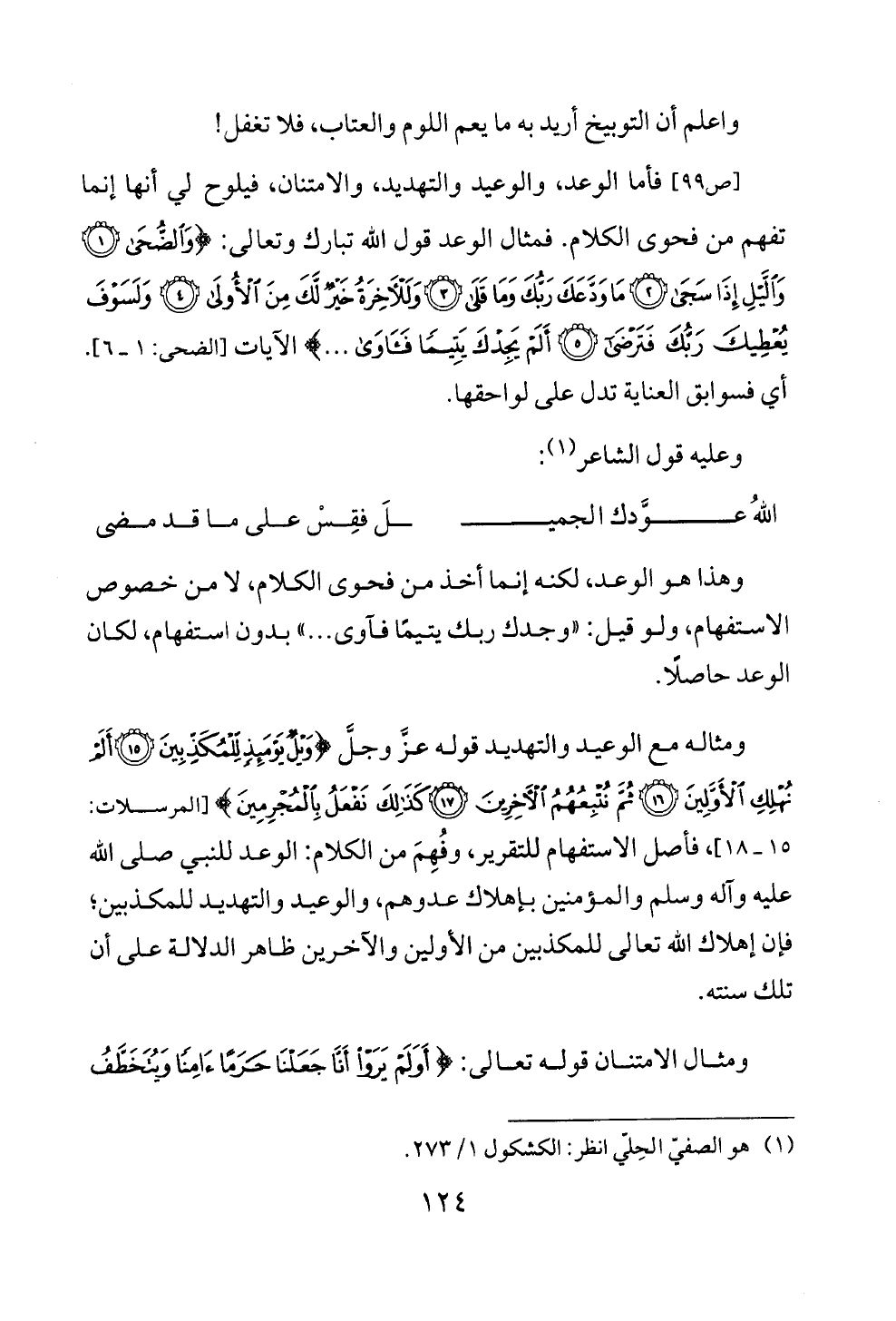 [ص ٩٩] فأما الوعد، والوعيد والتهديد، والامتنان، فيلوح لي أنها إنما تفهم من فحوى الكلام. فمثال الوعد قول الله تبارك وتعالى: {وَالضُّحَى (١) وَاللَّيْلِ إِذَا سَجَى (٢) مَا وَدَّعَكَ رَبُّكَ وَمَا قَلَى (٣) وَلَلْآخِرَةُ خَيْرٌ لَكَ مِنَ الْأُولَى (٤) وَلَسَوْفَ يُعْطِيكَ رَبُّكَ فَتَرْضَى (٥) أَلَمْ يَجِدْكَ يَتِيمًا فَآوَى ... } الآيات [الضحى: ١ ــ ٦]. أي فسوابق العناية تدل على لواحقها.
