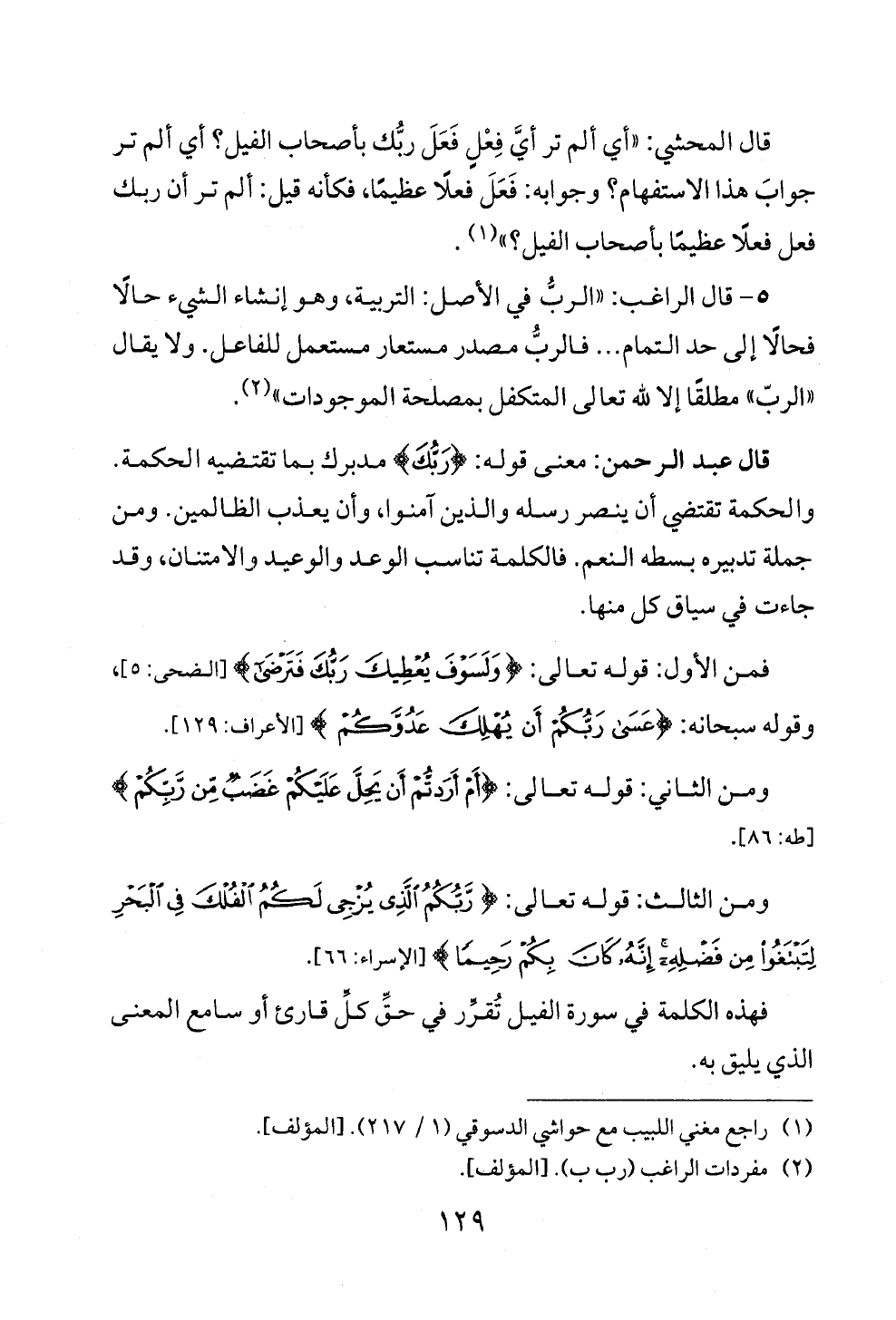 ٥ - قال الراغب: "الربُّ في الأصل: التربية، وهو إنشاء الشيء حالًا فحالًا إلى حد التمام ... فالربُّ مصدر مستعار مستعمل للفاعل. ولا يقال "الربّ" مطلقًا إلا لله تعالى المتكفل بمصلحة الموجودات" (¬٢).