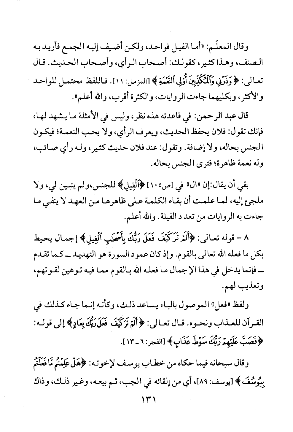 بقي أن يقال: إن "ال" في [ص ١٠٥] {الْفِيلِ} للجنس، ولم يتبين لي، ولا ملجئ إليه، لما علمت أن بقاء الكلمة على ظاهرها من العهد لا ينفي ما جاءت به الروايات من تعد د الفيلة. والله أعلم.