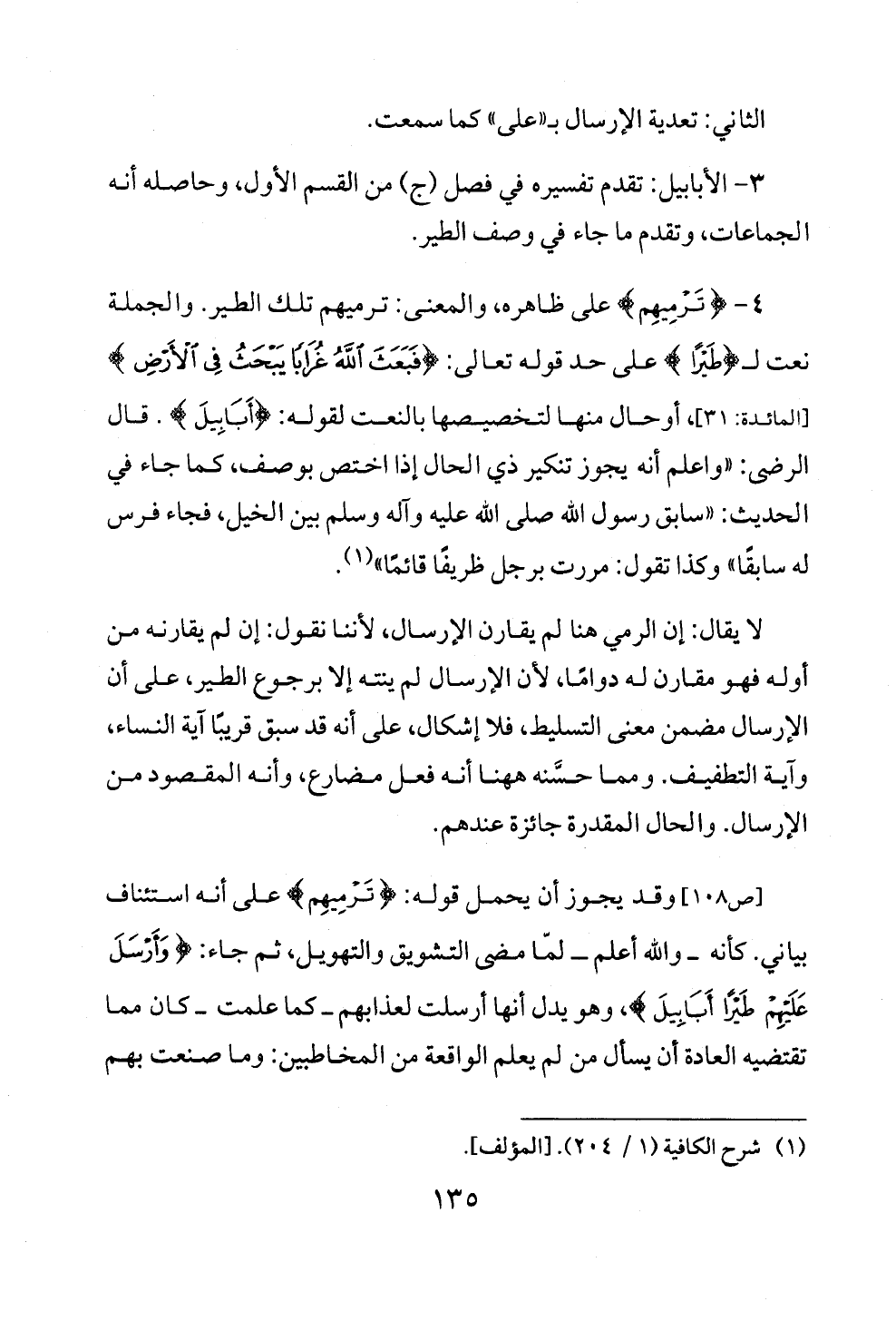 [ص ١٠٨] وقد يجوز أن يحمل قوله: {تَرْمِيهِمْ} على أنه استئناف بياني. كأنه ــ والله أعلم ــ لمّا مضى التشويق والتهويل، ثم جاء: {وَأَرْسَلَ عَلَيْهِمْ طَيْرًا أَبَابِيلَ}، وهو يدل أنها أرسلت لعذابهم ــ كما علمت ــ كان مما تقتضيه العادة أن يسأل من لم يعلم الواقعة من المخاطبين: وما صنعت بهم