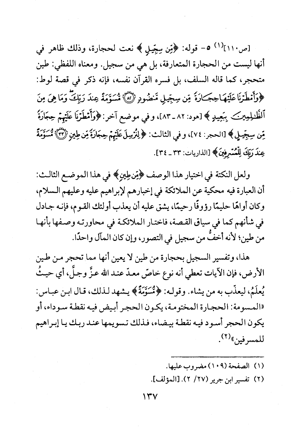 [ص ١١٠] (¬١) ٥ - قوله: {مِنْ سِجِّيلٍ} نعت لحجارة، وذلك ظاهر في أنها ليست من الحجارة المتعارفة، بل هي من سجيل. ومعناه اللفظي: طين متحجر، كما قاله السلف، بل فسره القرآن نفسه، فإنه ذكر في قصة لوط: {وَأَمْطَرْنَا عَلَيْهَا حِجَارَةً مِنْ سِجِّيلٍ مَنْضُودٍ (٨٢) مُسَوَّمَةً عِنْدَ رَبِّكَ وَمَا هِيَ مِنَ الظَّالِمِينَ بِبَعِيدٍ} [هود: ٨٢ ــ ٨٣]، وفي موضع آخر: {وَأَمْطَرْنَا عَلَيْهِمْ حِجَارَةً مِنْ سِجِّيلٍ} [الحجر: ٧٤]، وفي الثالث: {لِنُرْسِلَ عَلَيْهِمْ حِجَارَةً مِنْ طِينٍ (٣٣) مُسَوَّمَةً عِنْدَ رَبِّكَ لِلْمُسْرِفِينَ} [الذاريات: ٣٣ ــ ٣٤].