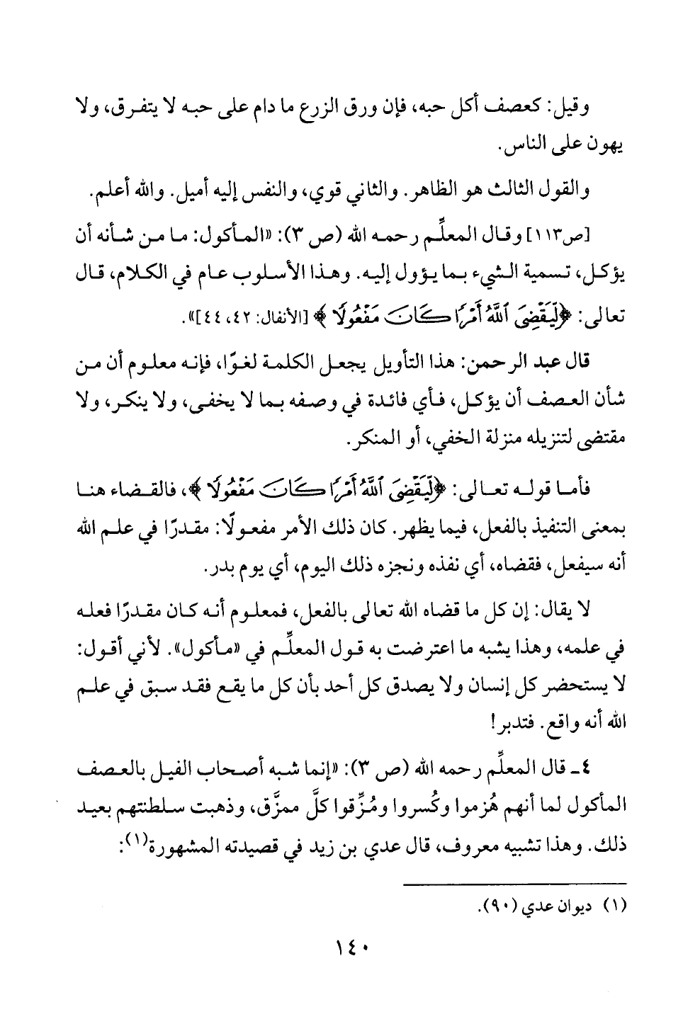 ٤ ــ قال المعلِّم رحمه الله (ص ٣): "إنما شبه أصحاب الفيل بالعصف المأكول لما أنهم هُزموا وكُسروا ومُزِّقوا كلَّ ممزَّق، وذهبت سلطنتهم بعيد ذلك. وهذا تشبيه معروف، قال عدي بن زيد في قصيدته المشهورة (¬١):
