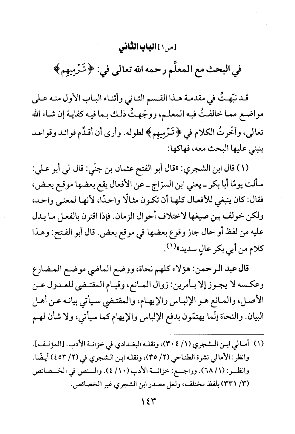 (¬١) أمالي ابن الشجري (١/ ٣٠٤)، ونقله البغدادي في خزانة الأدب. [المؤلف]. وانظر: الأمالي نشرة الطناحي (٢/ ٣٥)، ونقله ابن الشجري في (٢/ ٤٥٣) أيضًا. وانظر: (١/ ٦٨). وراجع: خزانة الأدب (١٠/ ٤). والنص في الخصائص (٣/ ٣٣١) بلفظ مختلف، ولعل مصدر ابن الشجري غير الخصائص.
