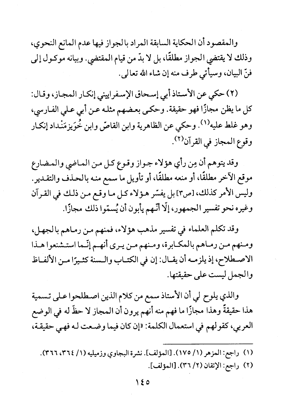 وقد يتوهم أن مِن رأي هؤلاء جواز وقوع كل من الماضي والمضارع موقع الآخر مطلقًا، أو منعه مطلقًا، أو تأويل ما سمع منه بالحذف والتقدير. وليس الأمر كذلك، [ص ٣] بل يفسّر هؤلاء كل ما وقع من ذلك في القرآن وغيره نحو تفسير الجمهور، إلّا أنّهم يأبون أن يُسمّوا ذلك مجازًا.