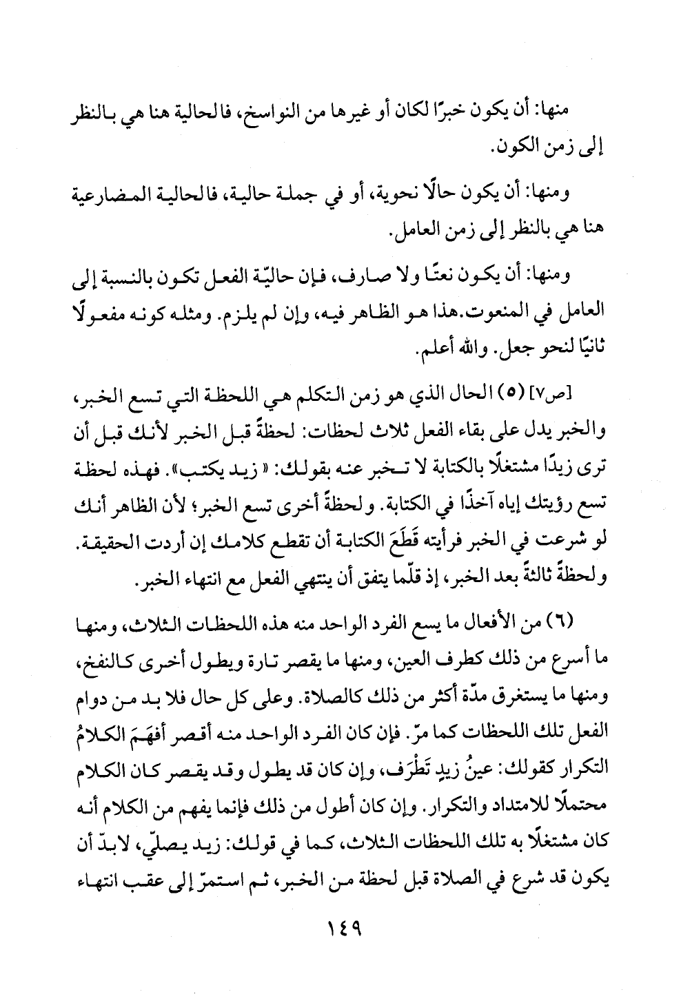 [ص ٧] (٥) الحال الذي هو زمن التكلم هي اللحظة التي تسع الخبر، والخبر يدل على بقاء الفعل ثلاث لحظات: لحظةً قبل الخبر لأنك قبل أن ترى زيدًا مشتغلًا بالكتابة لا تخبر عنه بقولك: " زيد يكتب". فهذه لحظة تسع رؤيتك إياه آخذًا في الكتابة. ولحظةً أخرى تسع الخبر؛ لأن الظاهر أنك لو شرعت في الخبر فرأيته قَطَعَ الكتابة أن تقطع كلامك إن أردت الحقيقة. ولحظةً ثالثةً بعد الخبر، إذ قلّما يتفق أن ينتهي الفعل مع انتهاء الخبر.