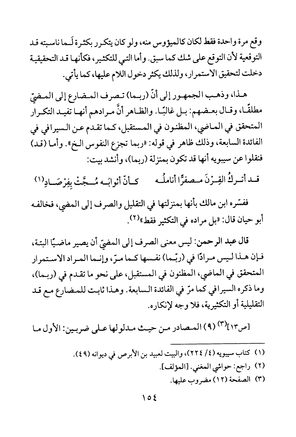 قال عبد الرحمن: ليس معنى الصرف إلى المضيّ أن يصير ماضيًا البتة، فإن هذا ليس مرادًا في (ربّما) نفسها كما مرّ، وإنما المراد الاستمرار المتحقق في الماضي، المظنون في المستقبل، على نحو ما تقدم في (ربما)، وما ذكره السيرافي كما مرّ في الفائدة السابعة. وهذا ثابت للمضارع مع قد التقليلية أو التكثيرية، فلا وجه لإنكاره.