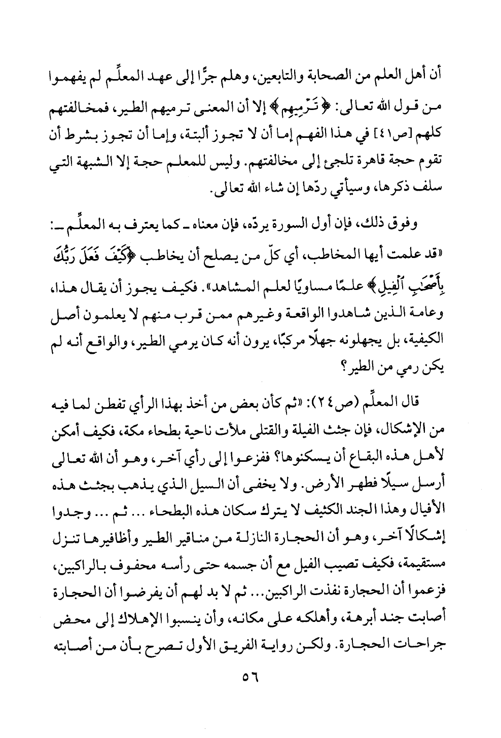 أن أهل العلم من الصحابة والتابعين، وهلم جرًّا إلى عهد المعلِّم لم يفهموا من قول الله تعالى: {تَرْمِيهِمْ} إلا أن المعنى ترميهم الطير، فمخالفتهم كلهم [ص ٤١] في هذا الفهم إما أن لا تجوز ألبتة، وإما أن تجوز بشرط أن تقوم حجة قاهرة تلجئ إلى مخالفتهم. وليس للمعلم حجة إلا الشبهة التي سلف ذكرها، وسيأتي ردّها إن شاء الله تعالى.