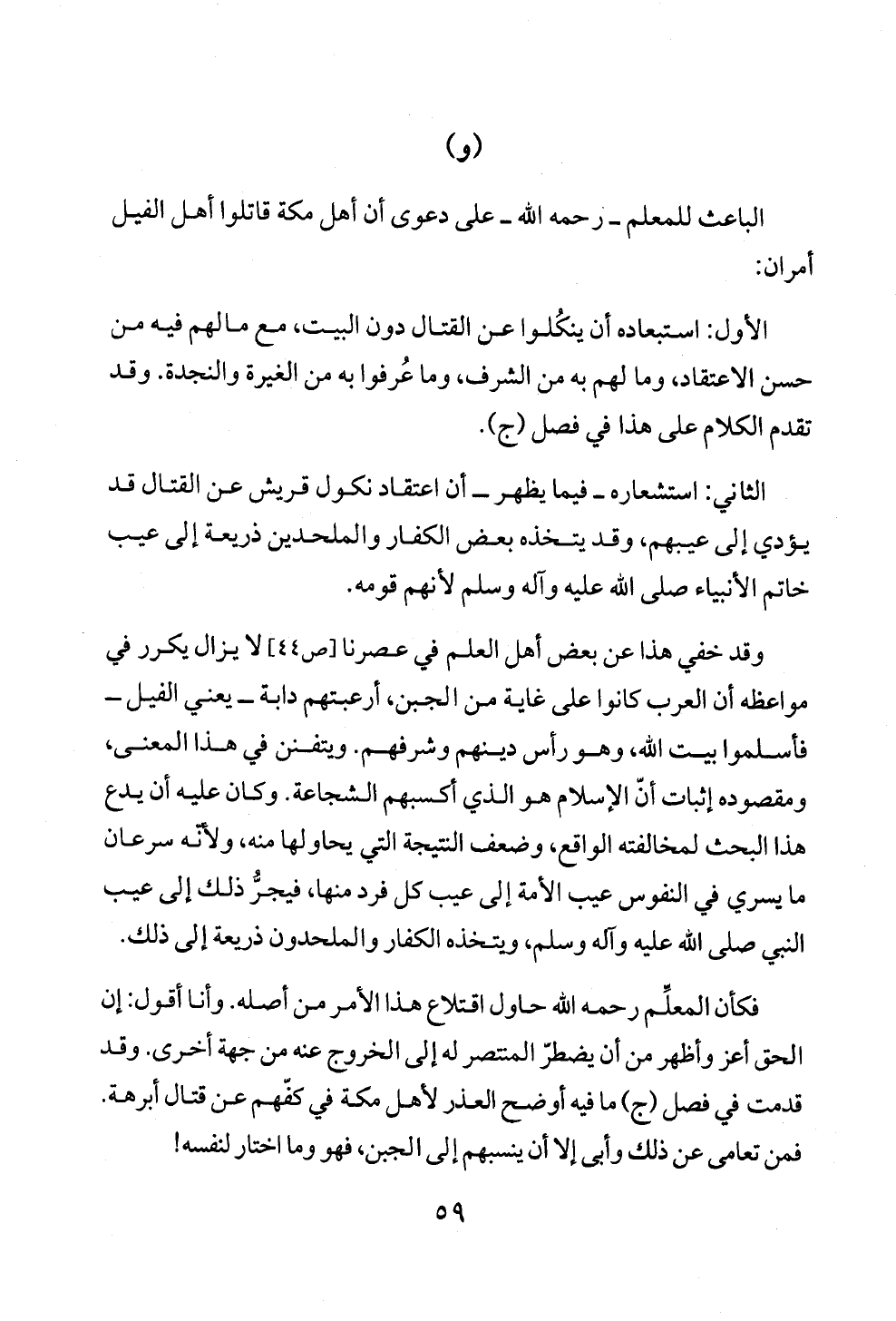 وقد خفي هذا عن بعض أهل العلم في عصرنا [ص ٤٤] لا يزال يكرر في مواعظه أن العرب كانوا على غاية من الجبن، أرعبتهم دابة ــ يعني الفيل ــ فأسلموا بيت الله، وهو رأس دينهم وشرفهم. ويتفنن في هذا المعنى، ومقصوده إثبات أنّ الإسلام هو الذي أكسبهم الشجاعة. وكان عليه أن يدع هذا البحث لمخالفته الواقع، وضعف النتيجة التي يحاولها منه، ولأنّه سرعان ما يسري في النفوس عيب الأمة إلى عيب كل فرد منها، فيجرُّ ذلك إلى عيب النبي صلى الله عليه وآله وسلم، ويتخذه الكفار والملحدون ذريعة إلى ذلك.